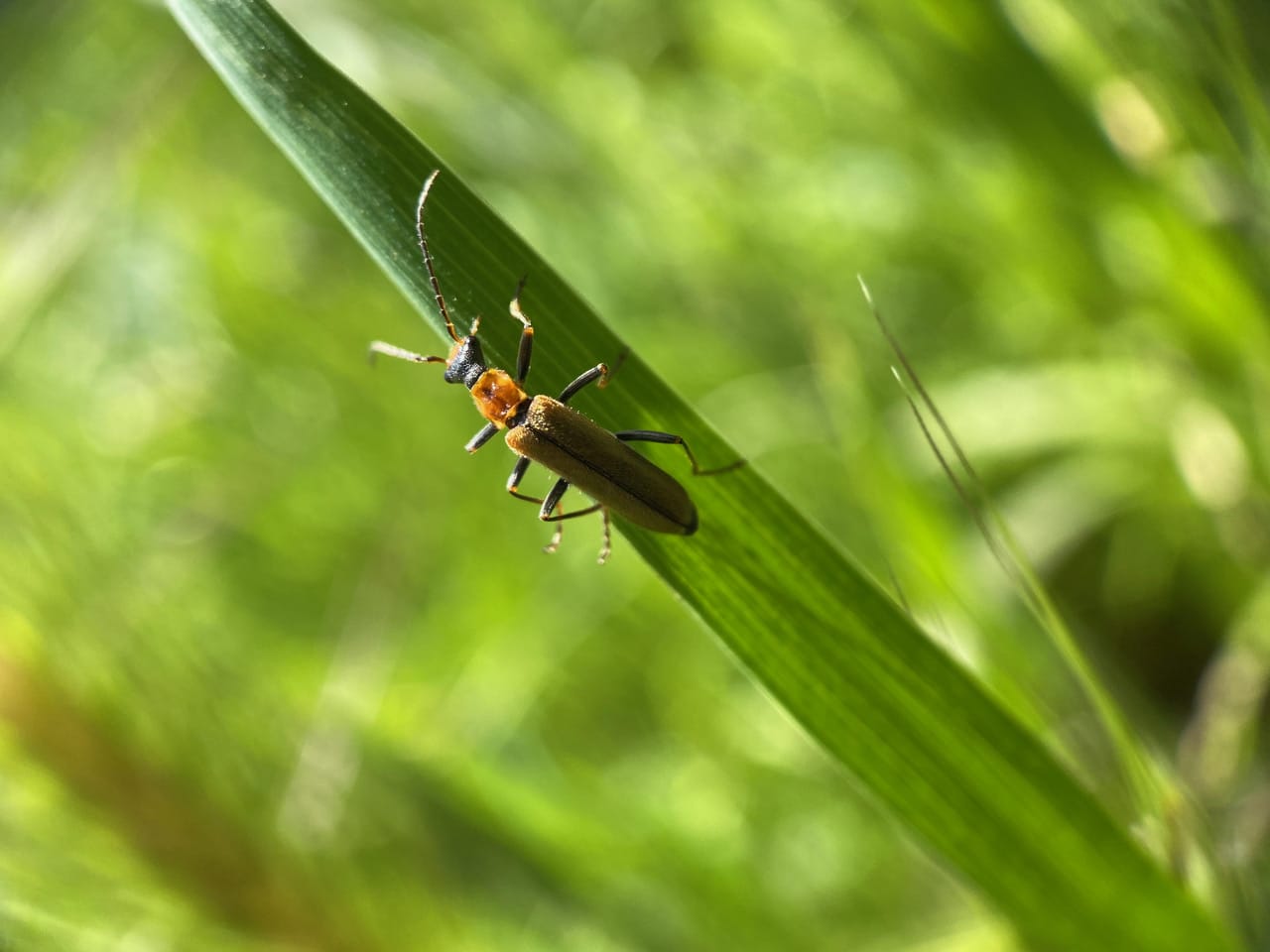 A small Soldier Beetle, Podabrus cavicollis (family Cantharidae) is climbing a blade of grass.