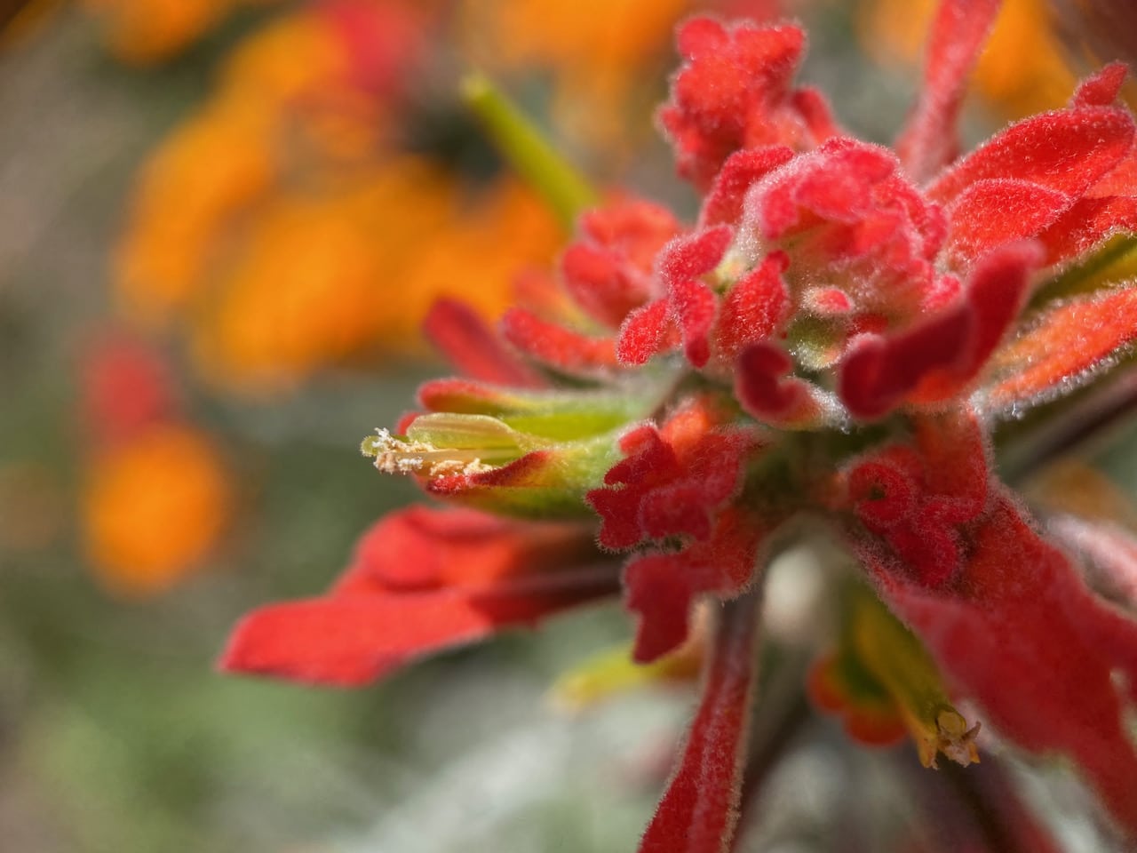 A member of the parasitic Broomrape family, Orobancaceae, the plant is a hemiparasite, meaning that although it is green and can photosynthesize, it also has the ability to sequester nutrients from neighboring plants, such as perennial grasses and sagebrush. The showy red structures of Indian Paintbrush are technically not petals, but bracts, a type of modified leaf. The tip of the sepals are tinged with red as well. The petals are usually green or yellow, and curiously arranged, with the upper two extending out into a long, pointed beak that envelops the stamens and style. With tubular design and red color, the flower is especially adapted for pollination by hummingbirds. The hummers have long slender bills that allow them to reach the nectar rewards at the base of the flowers.