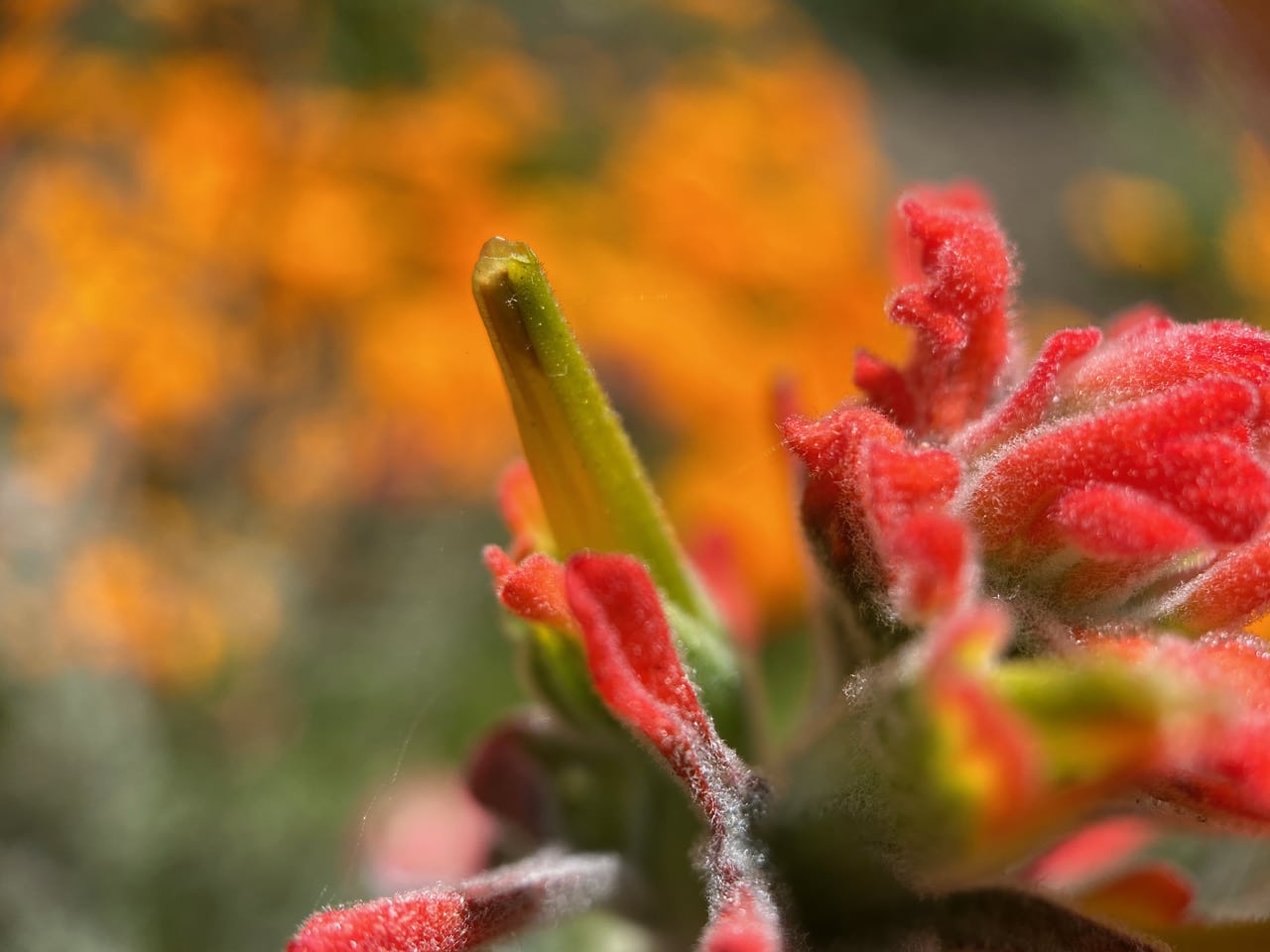Looking down on the inflorescence, I notice a green flower that is gaping open. I have never seen a Castilleja flower at this stage of development with the stamens exposed. On the other hand, has the flower been probed by a hummingbird? Anyway it is satisfying to see that the stamens are located right at the opening of the tubular corolla, ready to dab pollen on any visiting pollinator reaching for nectar.