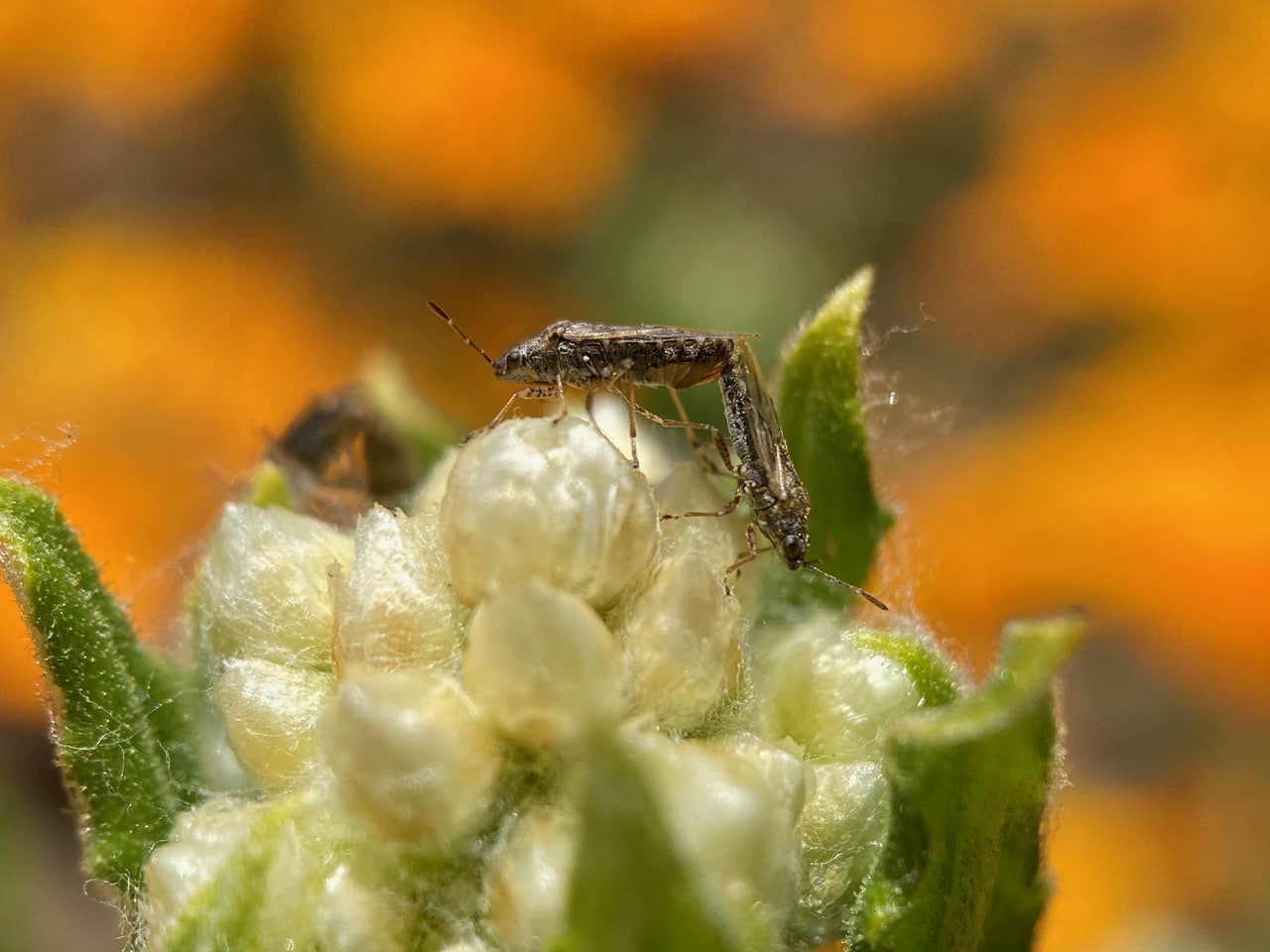 A pair of Seed Bugs, Nysius sp. (family Lygaeidae) is mating on an immature inflorescence of California Everlasting, Pseudoghaphalium californicum. The orange background is provided by an extensive patch of California Poppies.