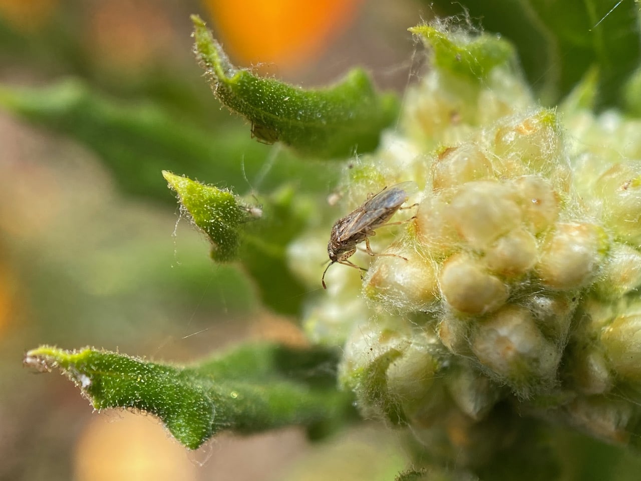 A False Chinch Bug, Nysius sp. (family Lygaeidae) has its proboscis sunk into an immature flowerhead of California Everlasting, Pseudognaphalium californicum. Like other seed bugs, some Nysius species are crop pests of wheat and other grains.