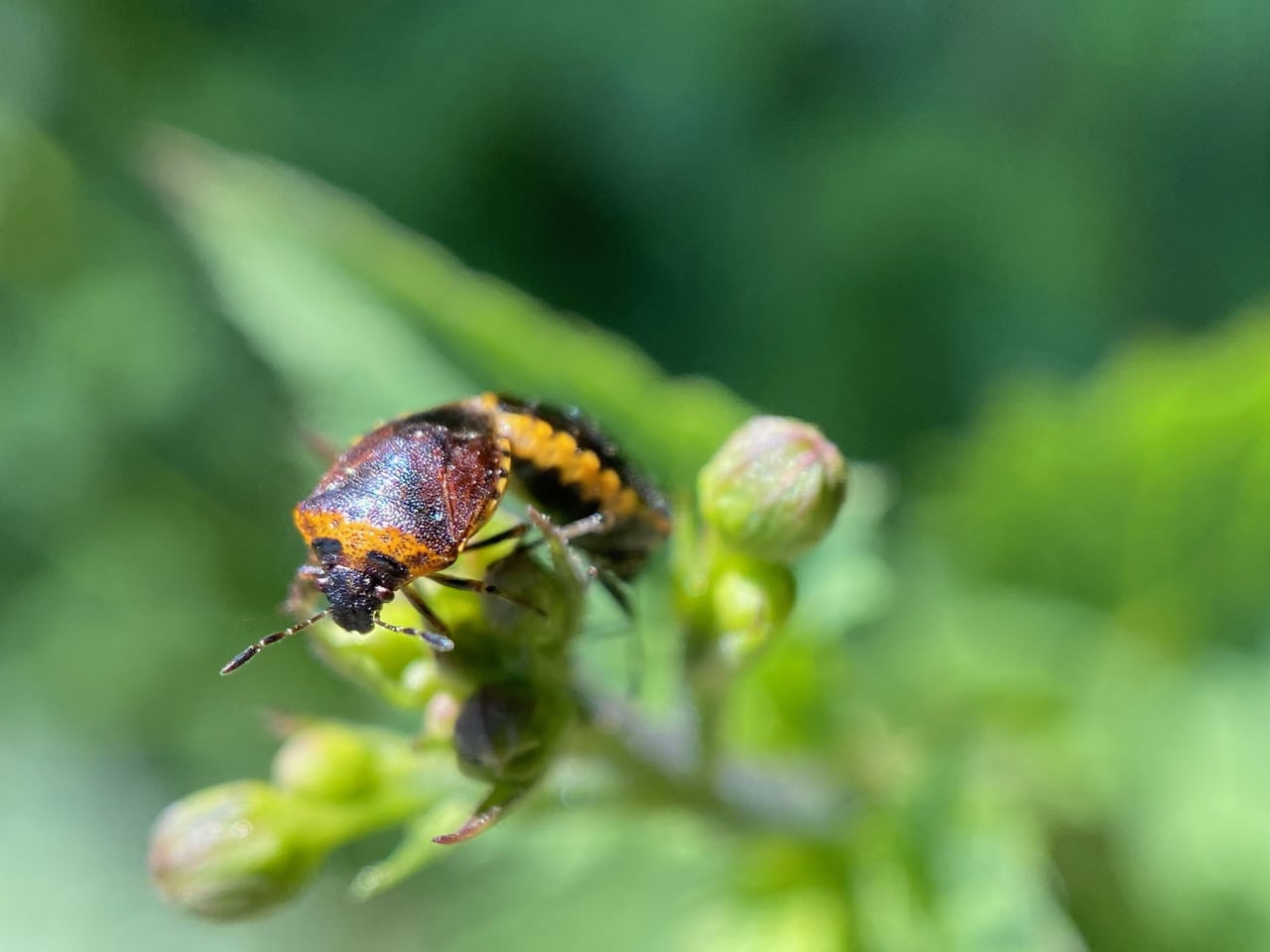 A pair of Stink Bugs, Cosmopepla urhleri (family Pentatomidae) is mating on the flower buds of California Bee Plant, Scrophularia californica. The species is easily recognizable for the color pattern – black with an orange transhumeral band with black spots. What’s more, the bug uses Scropularia californica as a host plant, and is seldom found on other plants.