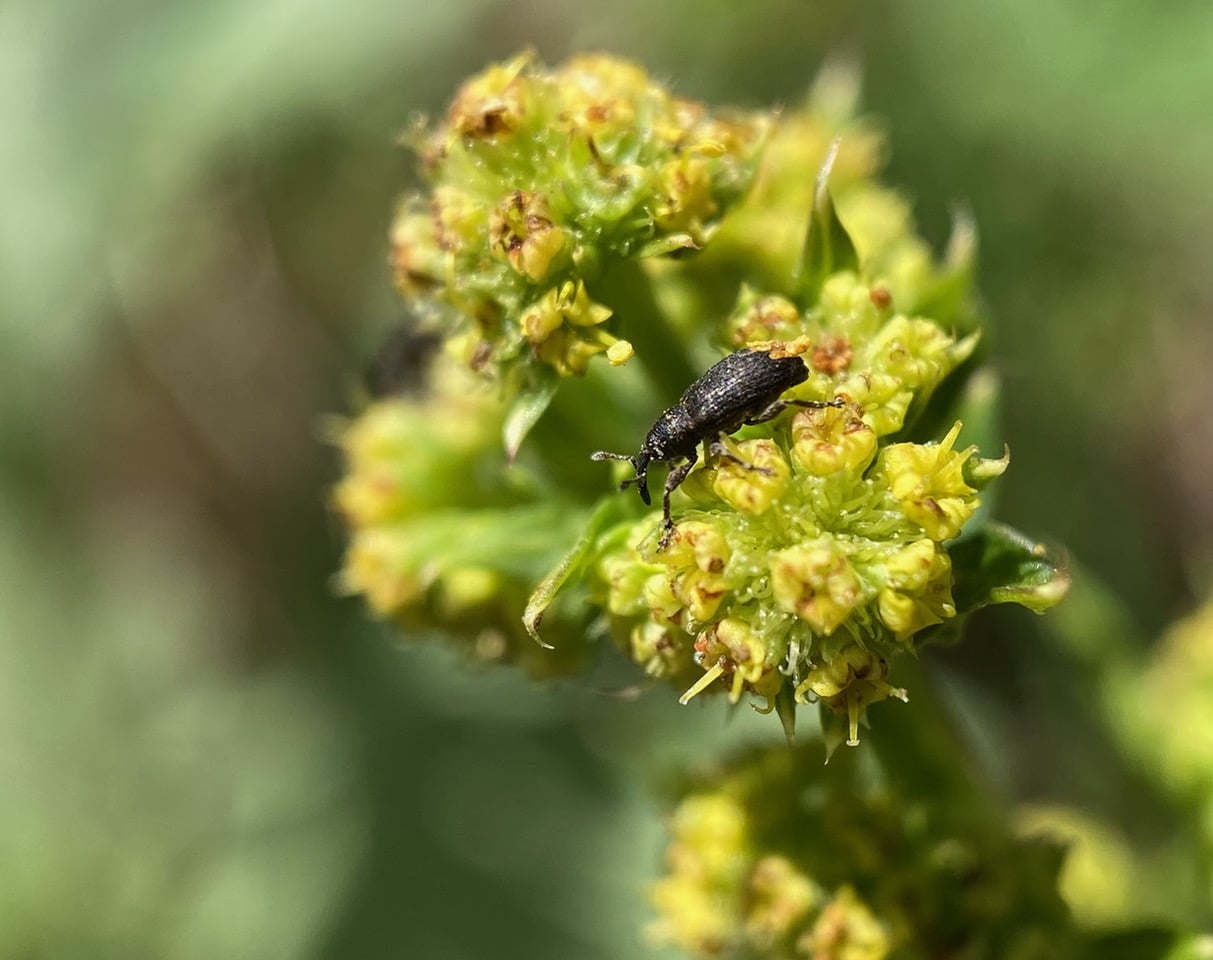 A Weevil is foraging on an inflorescence of Pacific Sanicle, Sanicula crassicaulis.