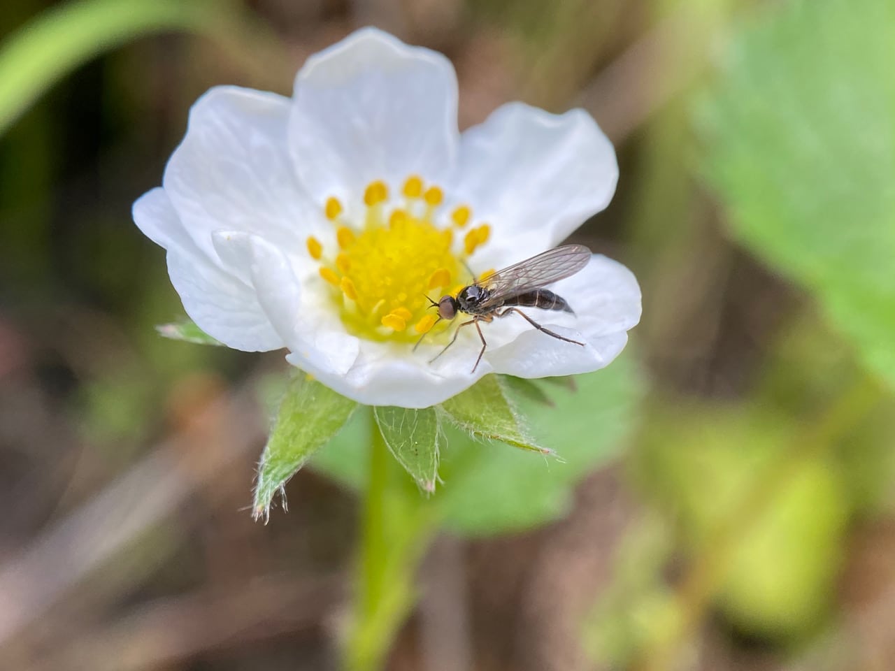 A Dance Fly (family Empididae) is taking nectar from a flower of Wood Strawberry, Fragaria vesca. Note its straight, long proboscis.