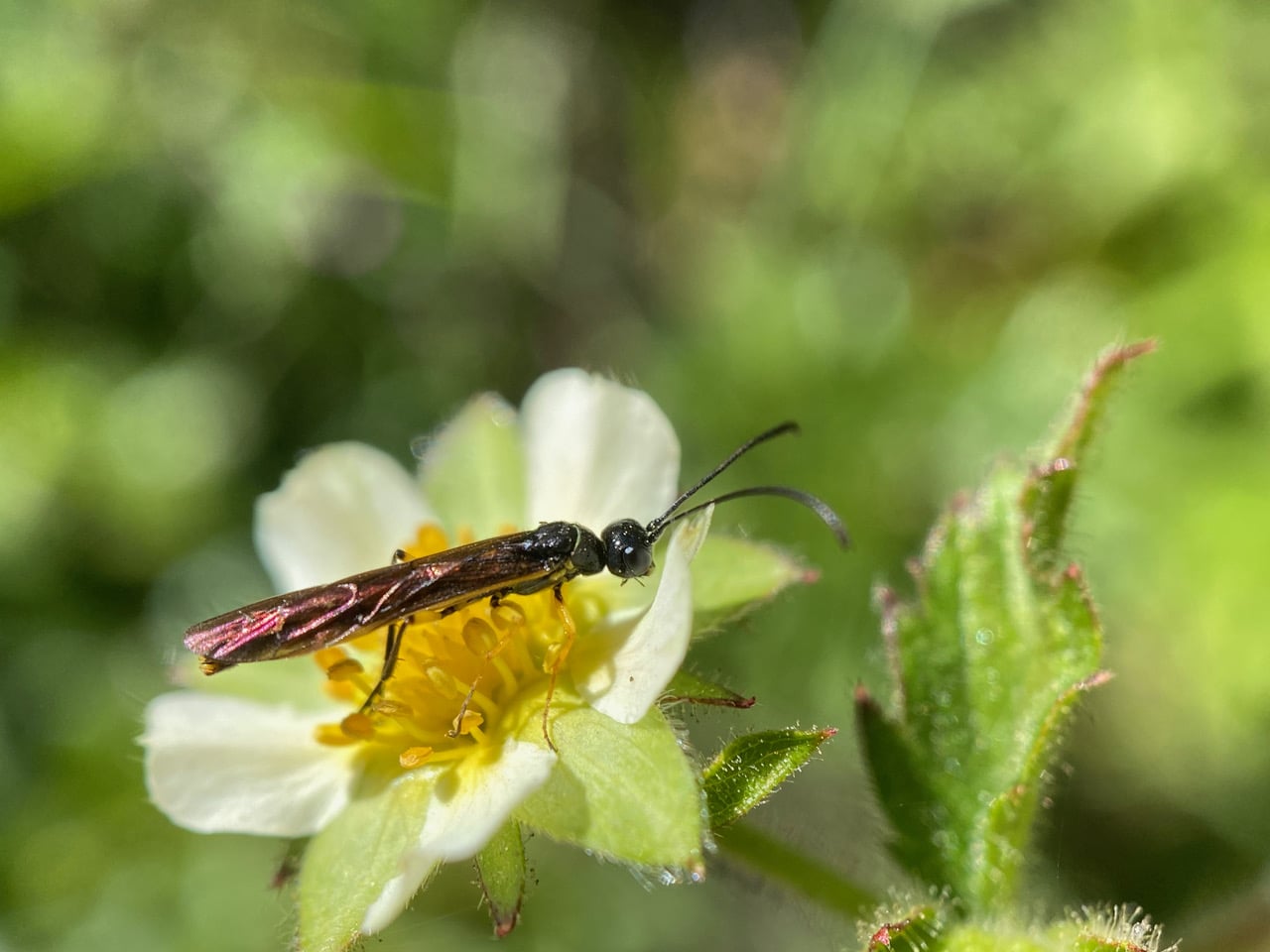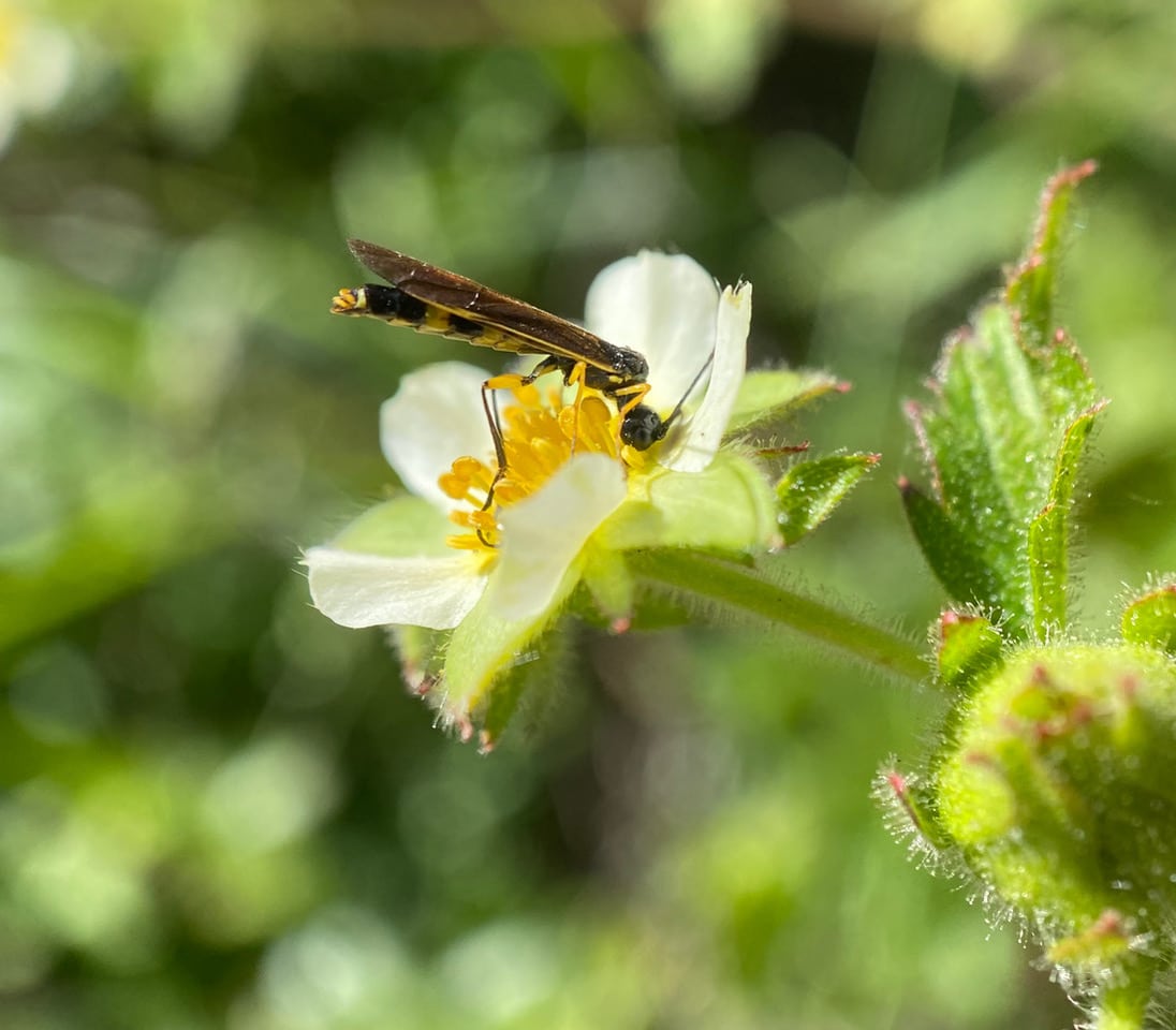 A Stem Sawfly, Calameuta sp.(family Cephidae) is foraging on a flower of Sticky Cinquefoil, Drymocallis glandulosa. Look, Ma, no waist!