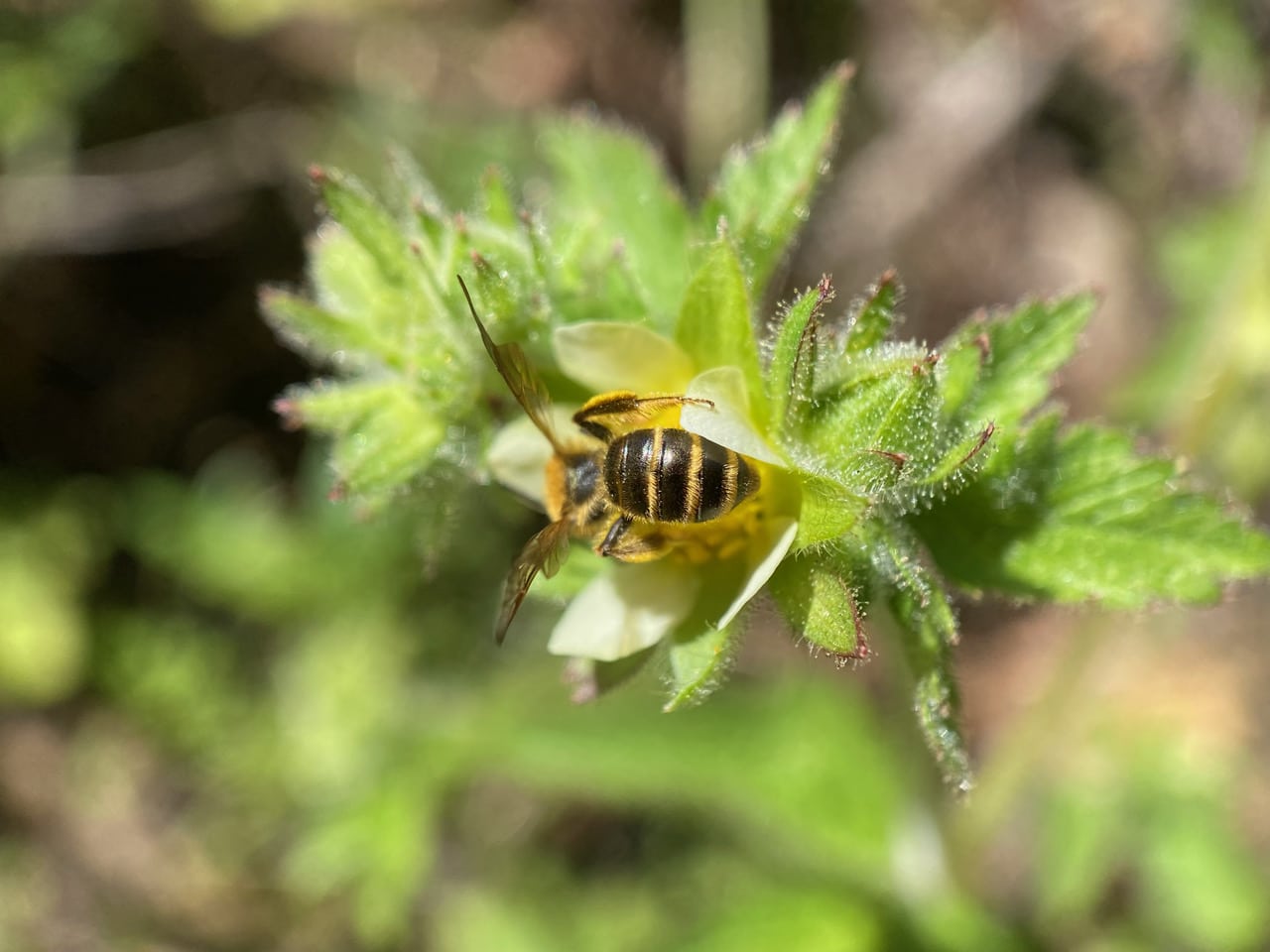 Here’s another little bee visiting a flower of Sticky Cinquefoil. It has golden hairs!