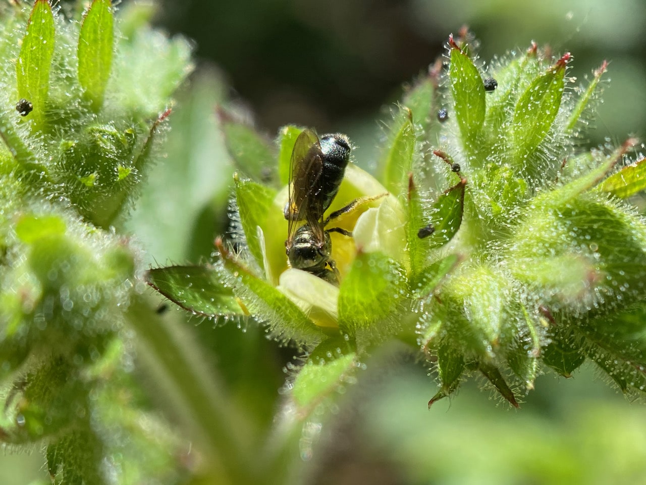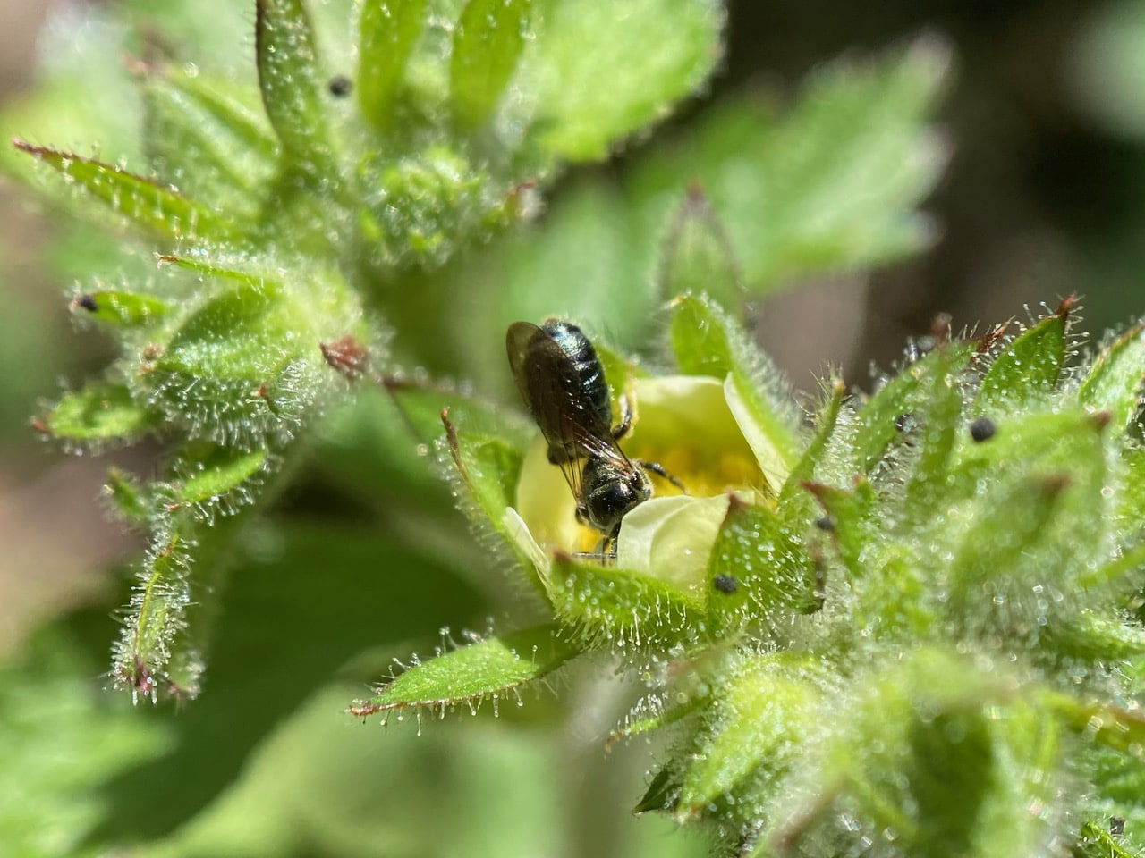 A small black bee enters a flower of Sticky Cinquefoil that is barely open.