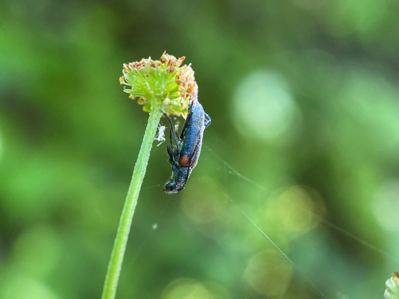 Ooh, another insect has fallen prey to a spider on Pacific Sanicle (family Apiaceae)! Though wrapped up in spider silk, it is still recognizable as a Flower Longhorn Beetle, Grammoptera militaris (family Cerambycidae, subfamily Lepturinae).