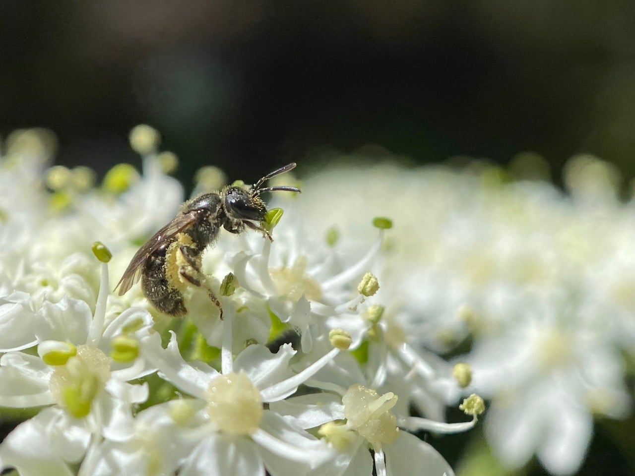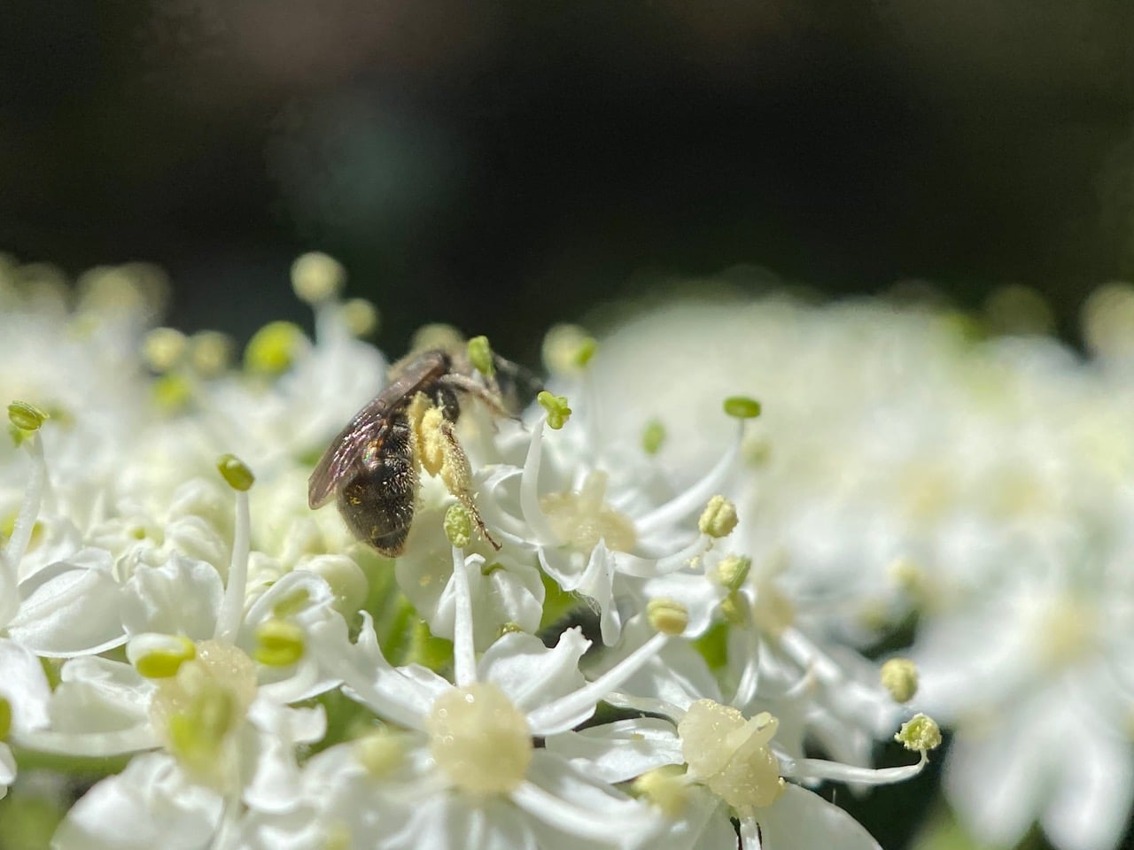 A small bee is collecting pollen from the anthers of the Cow Parsnip flowers. I think it is a Metallic Sweat Bee, Lassioglossum (dialictus) sp. (family Halictidae).