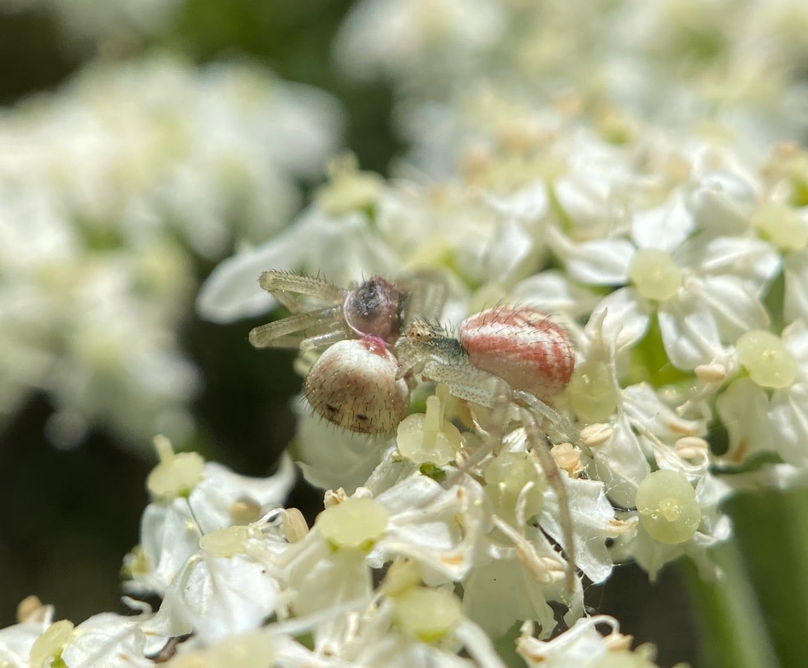 Ouch! It is always jarring to the senses to witness cannibalism. A Crab Spider, Mecaphesa sp.(family Thomisidae) is feeding on a conspecific on a flower umbel of Cow Parsnip. There are so many of these spiders on the plant, it is inevitable that this would happen. Cannibalism provides sustenance during food scarcity, while eliminating competition.