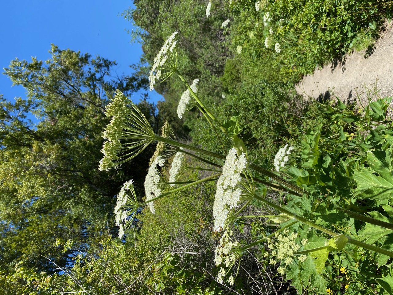 Cow Parsnip, Heracleum maximum is blooming gloriously, encroaching on the narrow path at the northern section of Skyline Trail.