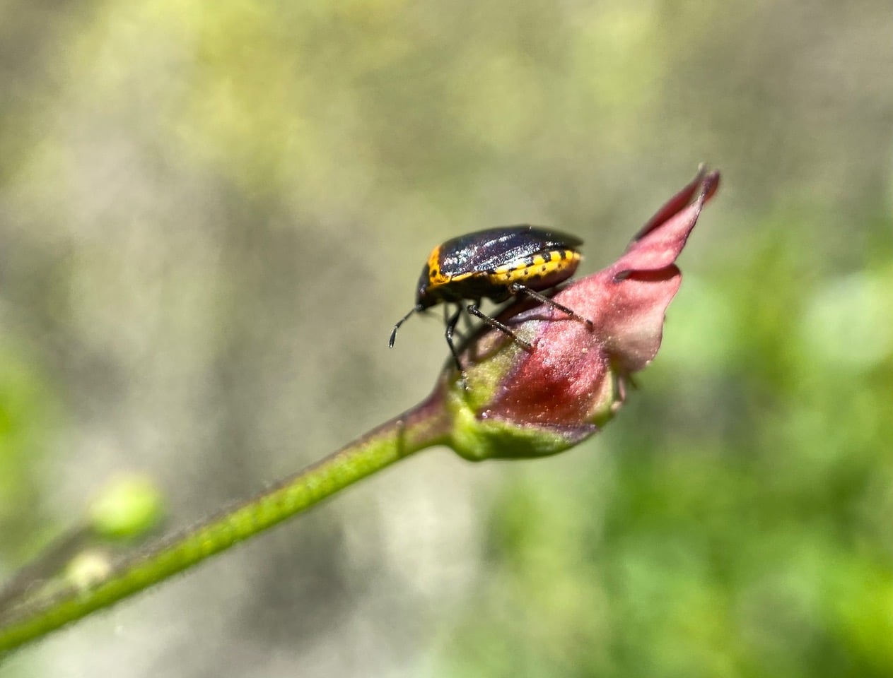 Pentatomidae is a family of insects belonging to the order Hemiptera or “true bugs”. As hemipterans, the pentatomids have piercing-sucking mouthparts, and most are phytophagous, including several species that are severe pests on agricultural crops. Stink Bugs feed on plant fluids by inserting their needlelike mouthparts into stems, leaves or seed pods. While feeding, they inject materials into the plant to aid in digestion and sap removal. Penetration by the mouthparts can cause physical damage, much like stabbing the plant with a fine needle. Cosmopepla uhleri is so small that the damage is generally limited to fine stippling on the leaves of California Bee Plant.
