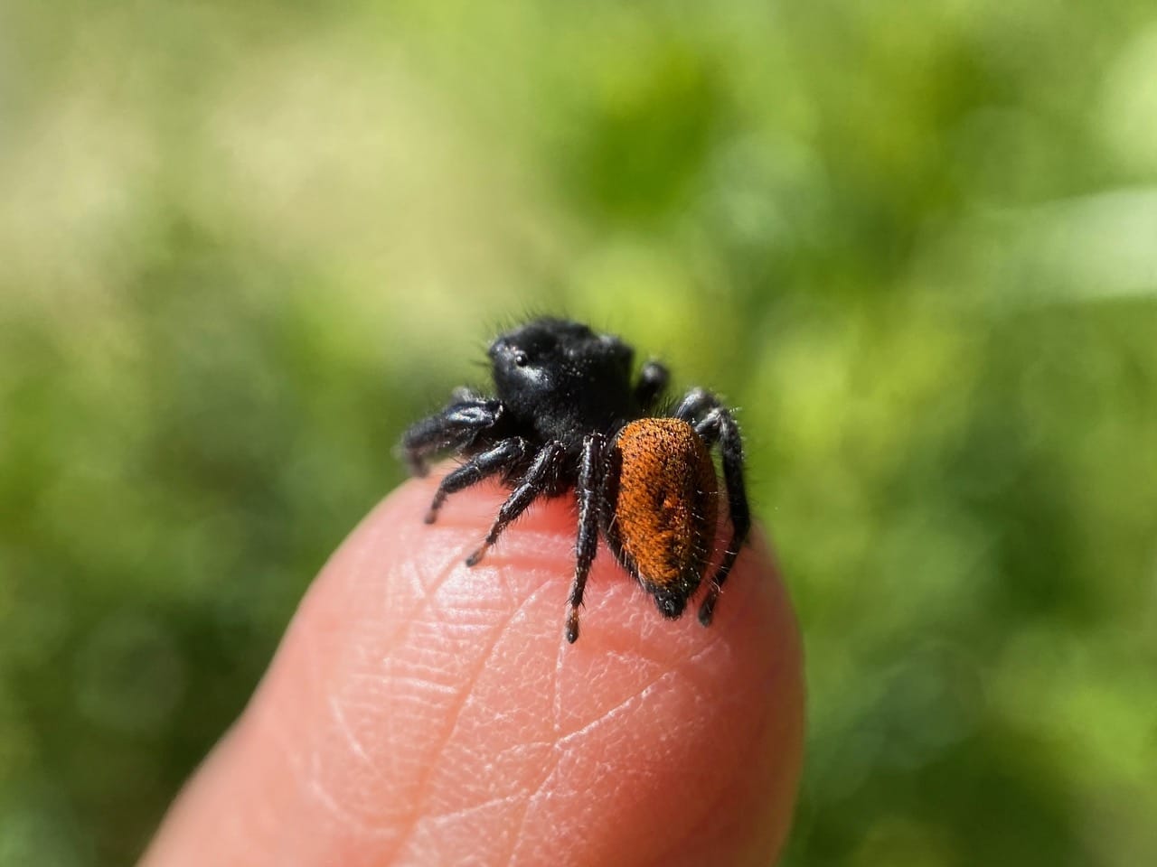 Jumping spiders have excellent vision, with among the highest acuities in invertebrates. The 8 eyes are grouped four on the face (the two big Anterior Median Eyes in the middle, and two smaller Anterior Lateral eyes to the side), and four on top of the carapace. The anterior median eyes provide high acuity but small field of view, while the other six eyes act like our peripheral vision, with lower resolution but broad field of view. Since all eight eyes are fixed in place and can’t pivot independently from the body like human eyes can, jumping spiders must turn to face whatever they want to see well. This includes moving their cephalothorax up and down, an endearing behavior.