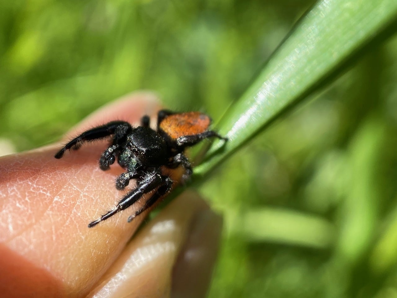 I hold the grass tip to steady it for a pictures of the spider. Phidippus promptly walks onto my finger!