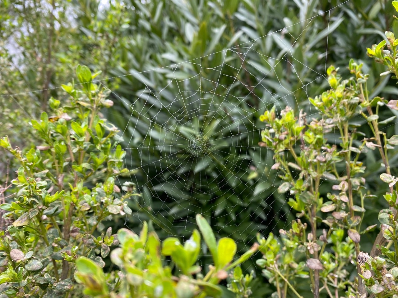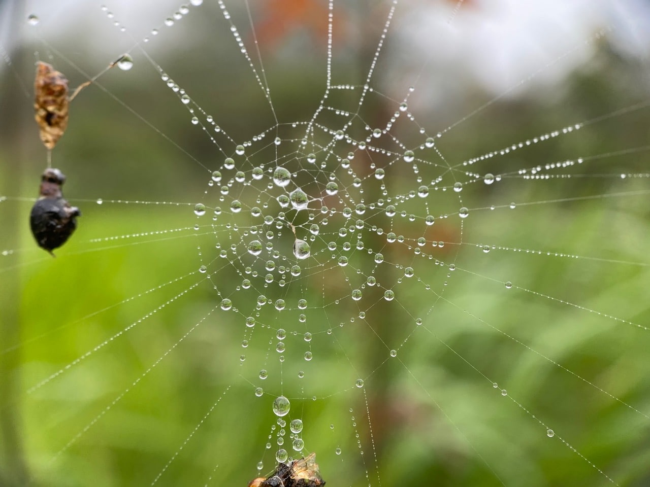 A spider web has gathered fog on its silk strands, the water joining into larger drops in the middle of the orb.