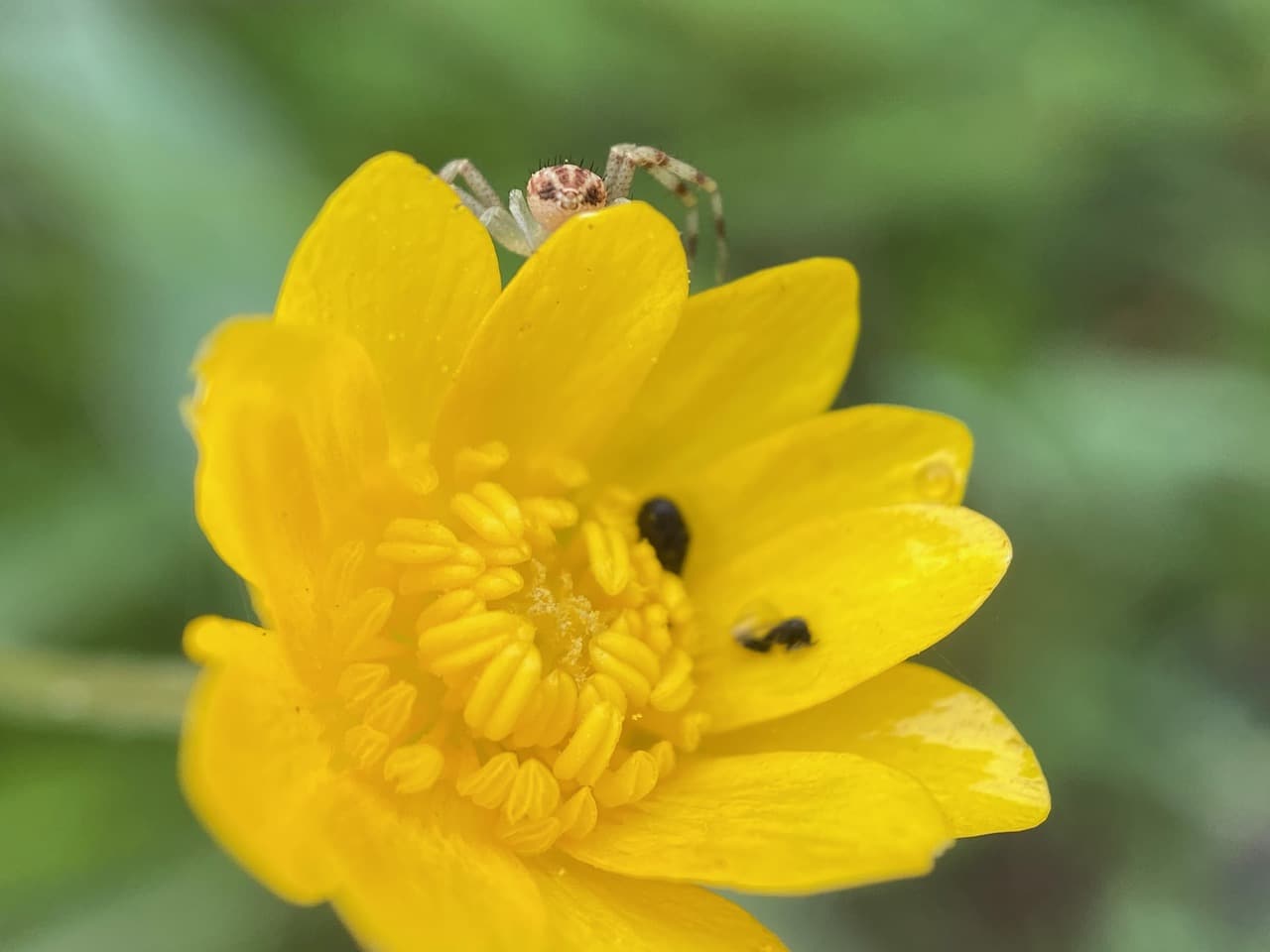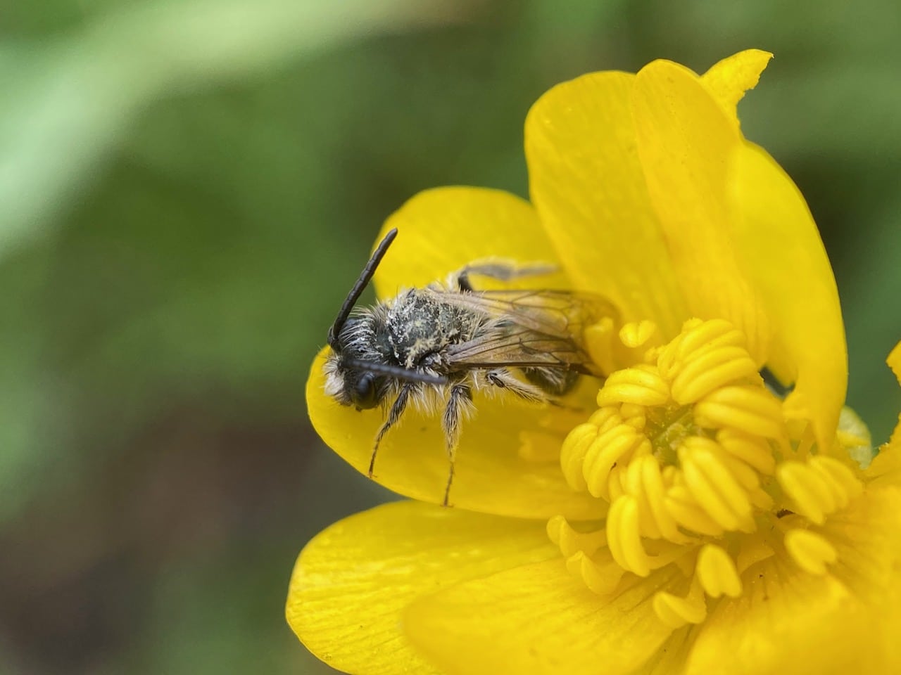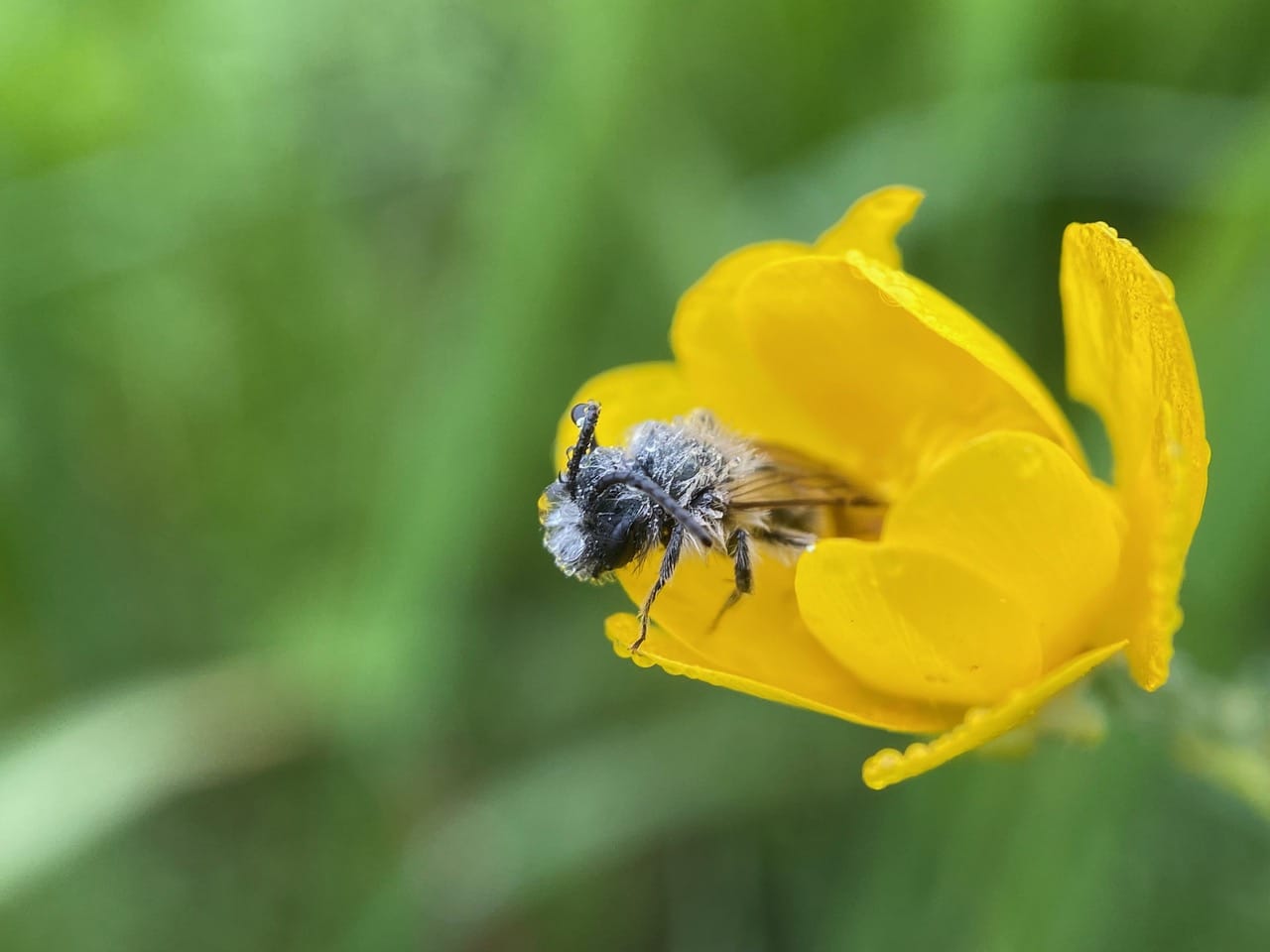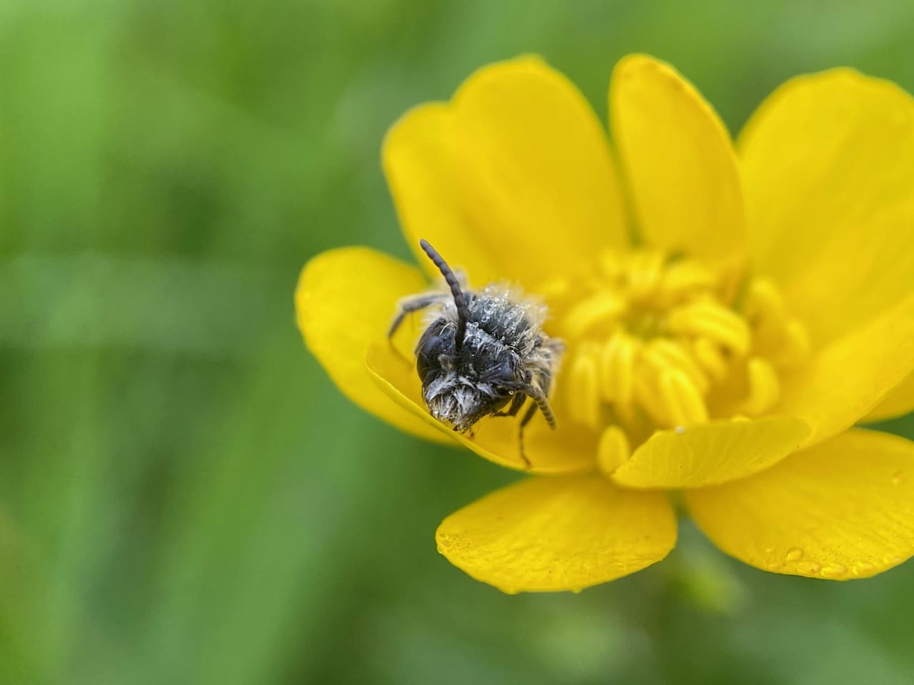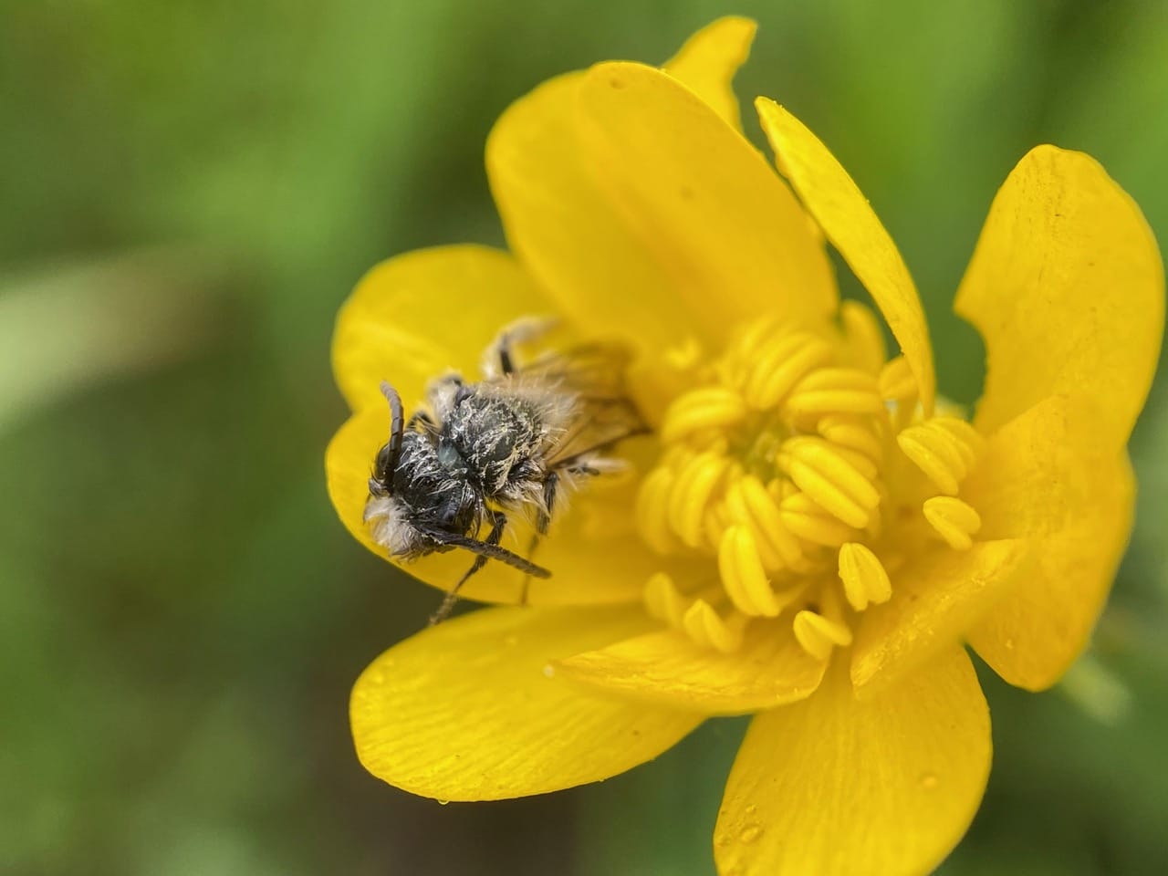 10:10 am. I return to check on little Sleepy Head. The buttercup flower has opened up a little more, but the bee still looks pretty wet. He has not moved.