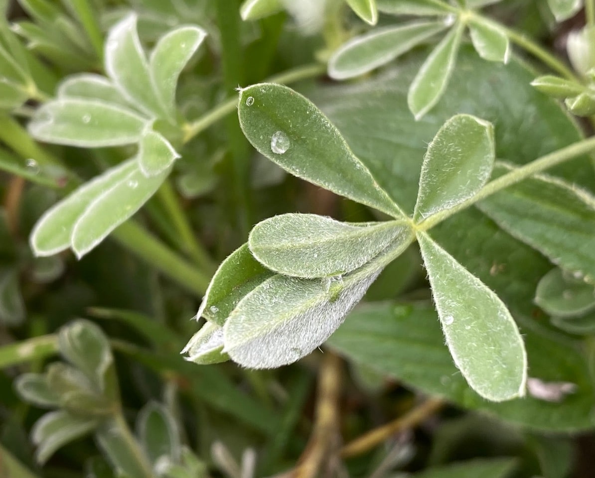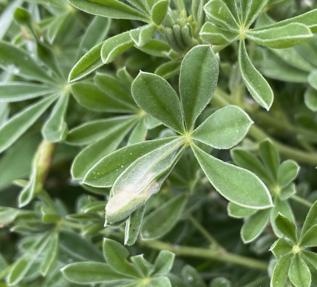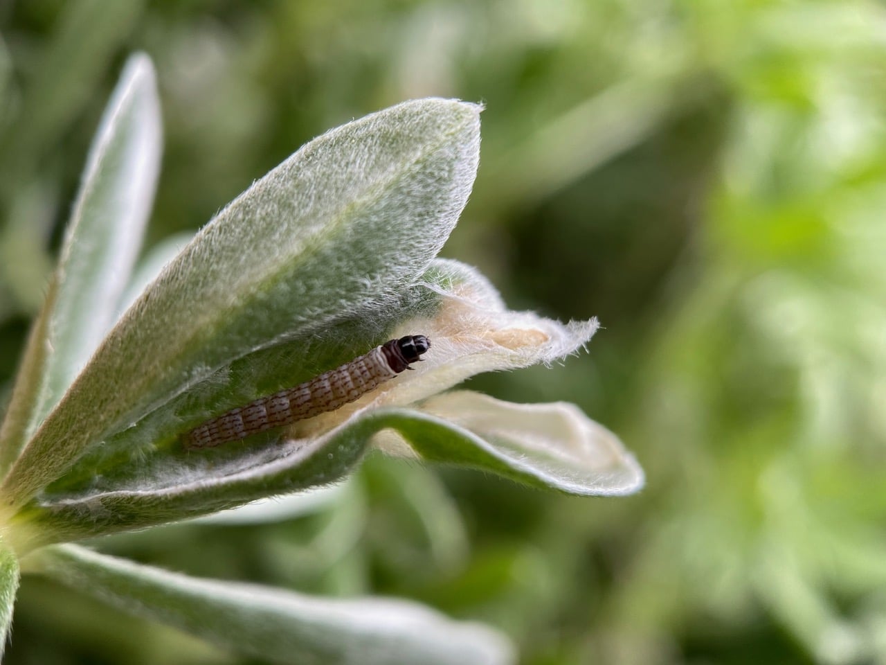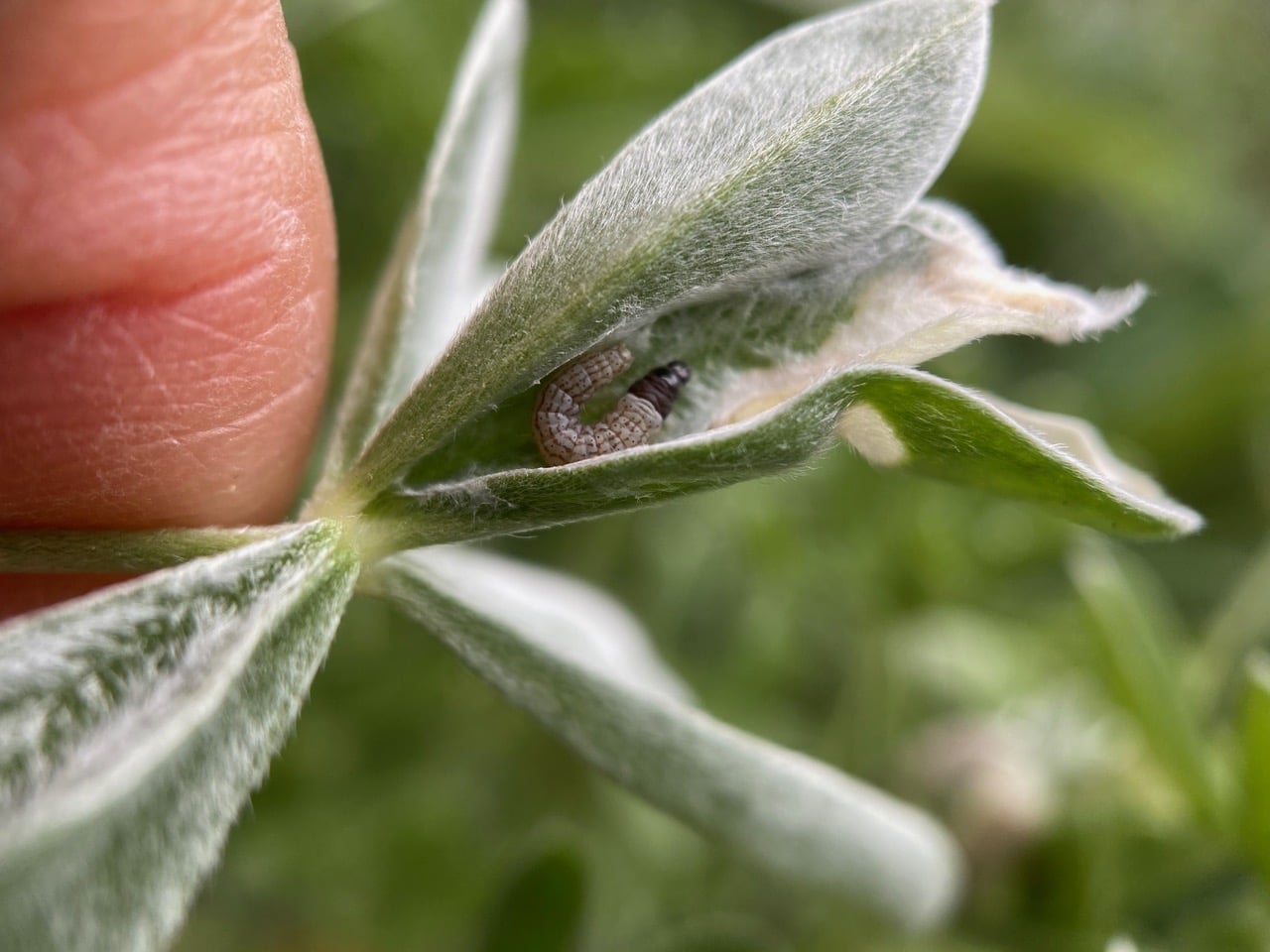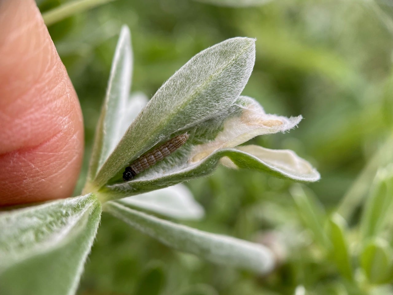 Here’s another caterpillar shelter. The architecture of the shelters on the lupine are amazingly consistent – usually three adjacent leaflets are loosely bound together, then a fourth leaflet is pulled over from the opposite side and tied roof-like over the other leaflets.