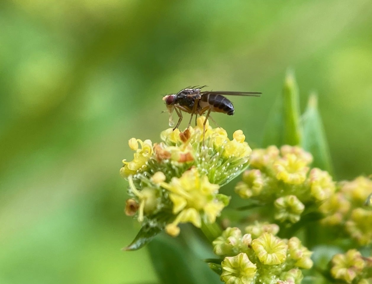 Ooh, the small fly is spitting into a flower of Pacific Sanicle.