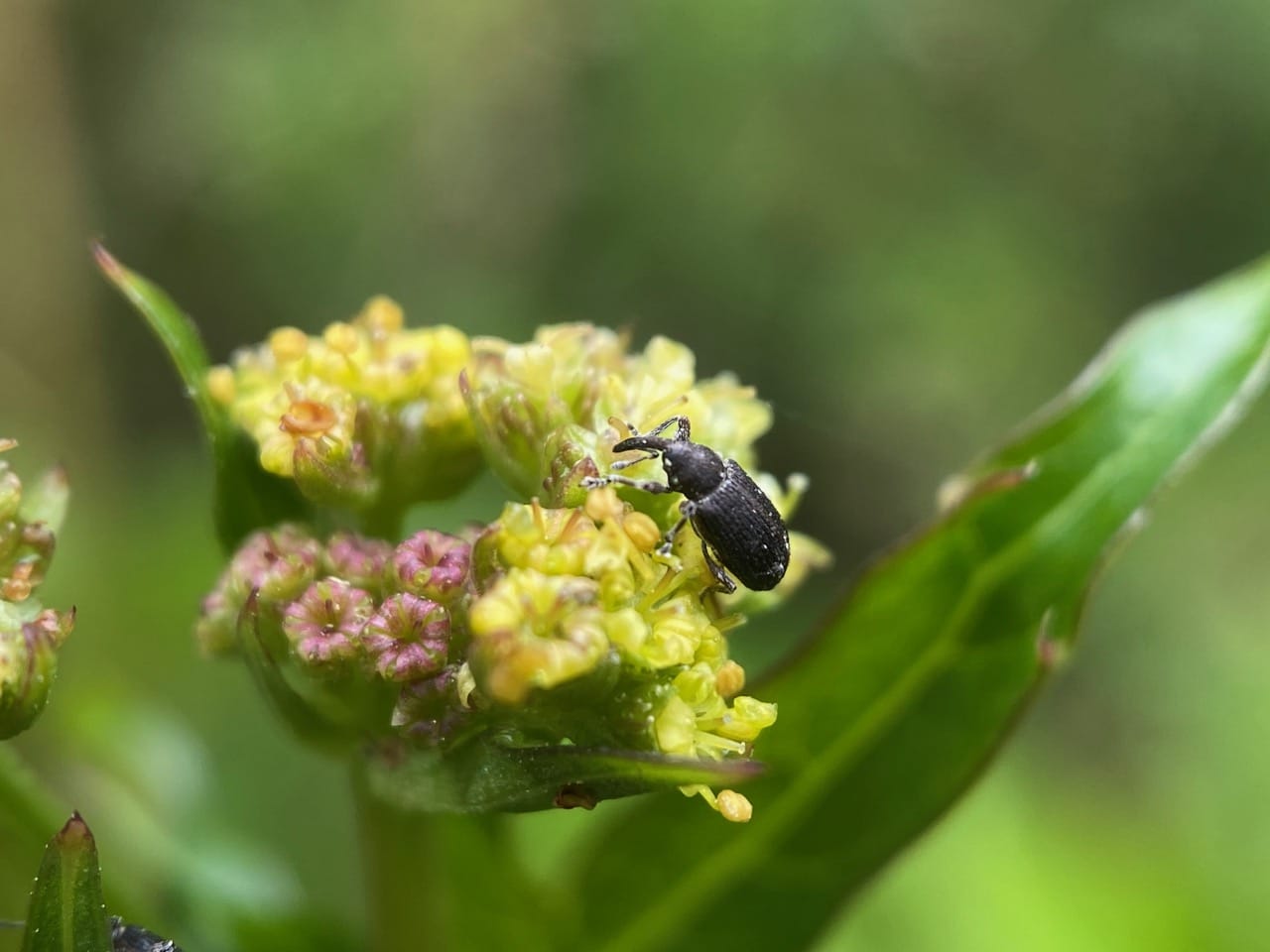 A tiny Weevil (family Curculionidae) is moving on a cluster of flowers of the Pacific Sanicle, Sanicula crassicaulis.