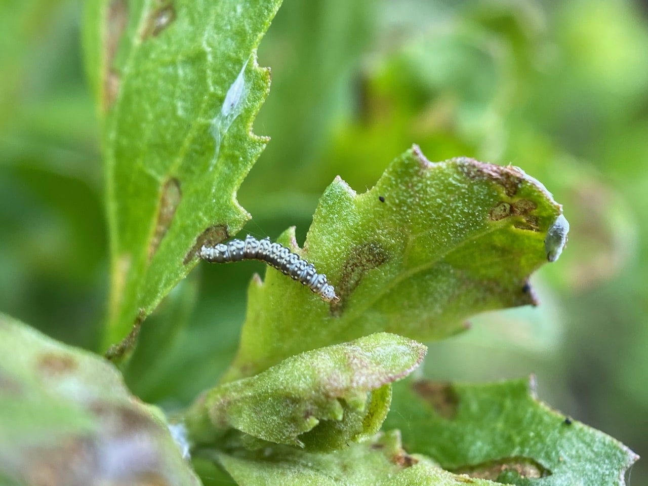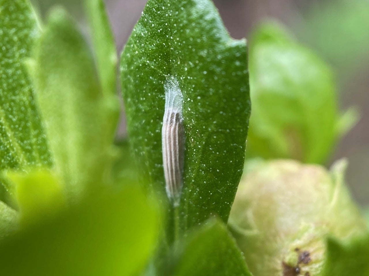 This caterpillar has spun some silk around a cluster of flower buds on an American Wintercress, not a known host plant for the butterfly.