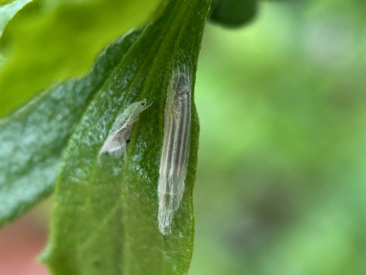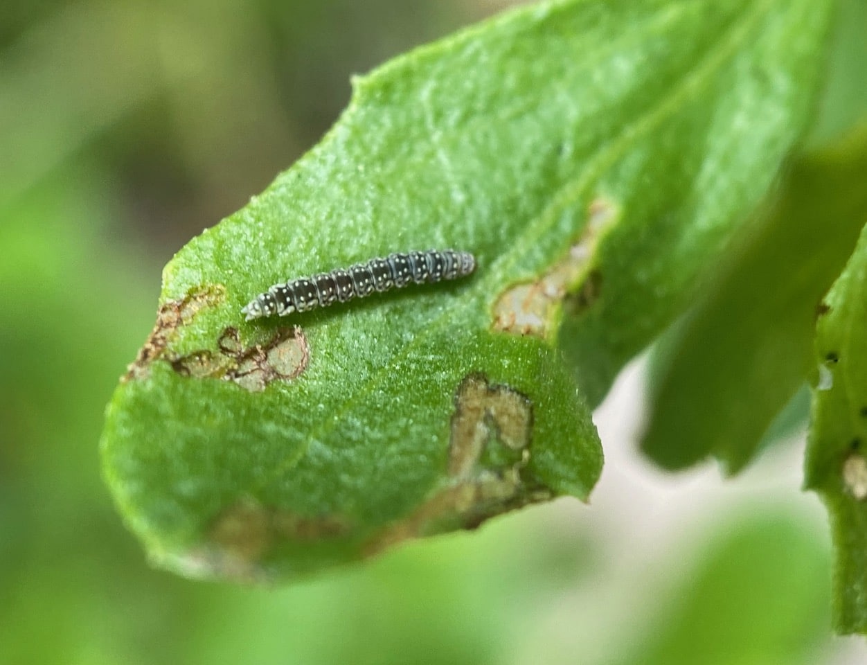 I gently pulled apart one of the leaflets of this shelter to reveal a little striped caterpillar inside with a black head. It immediately scoots forward in alarm. The whitish sections of the leaves are the parts that the caterpillar has been feeding on from the safety of its shelter.