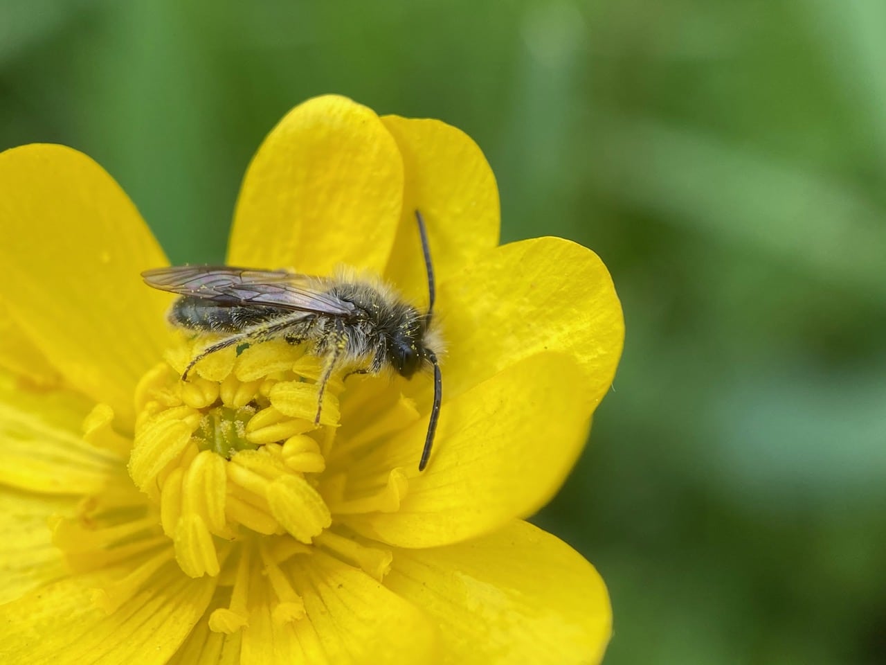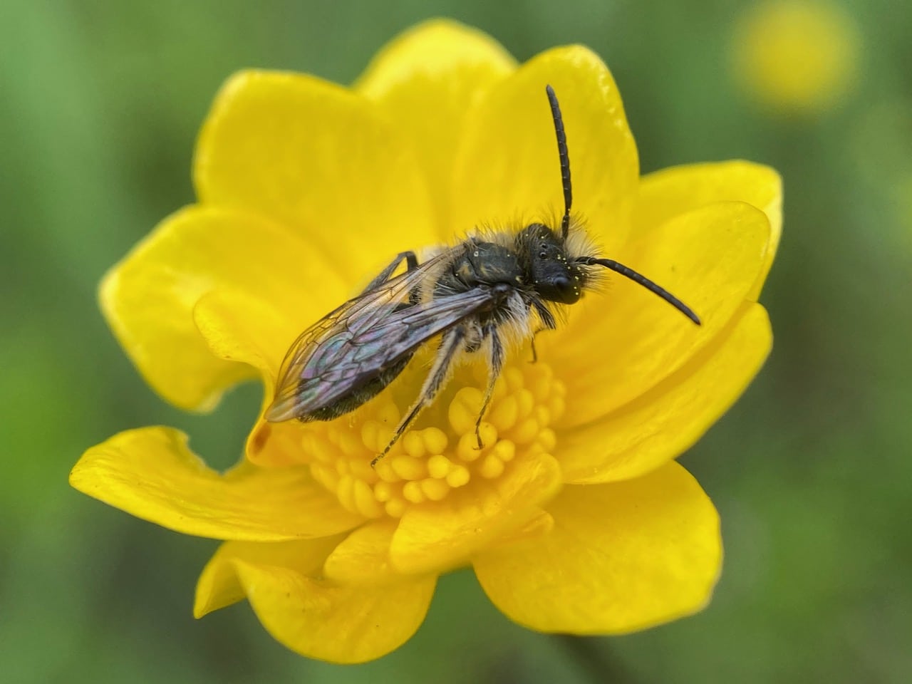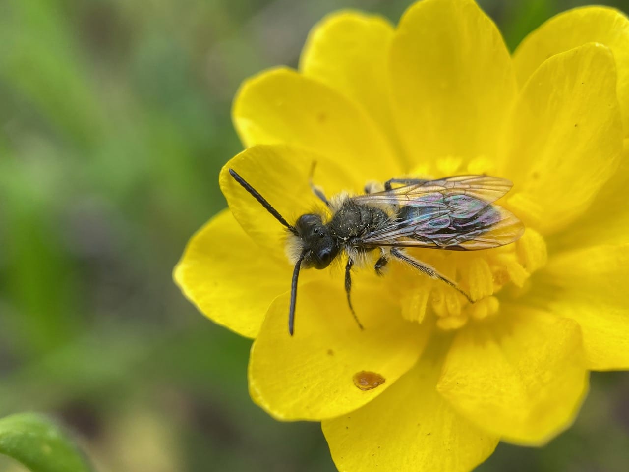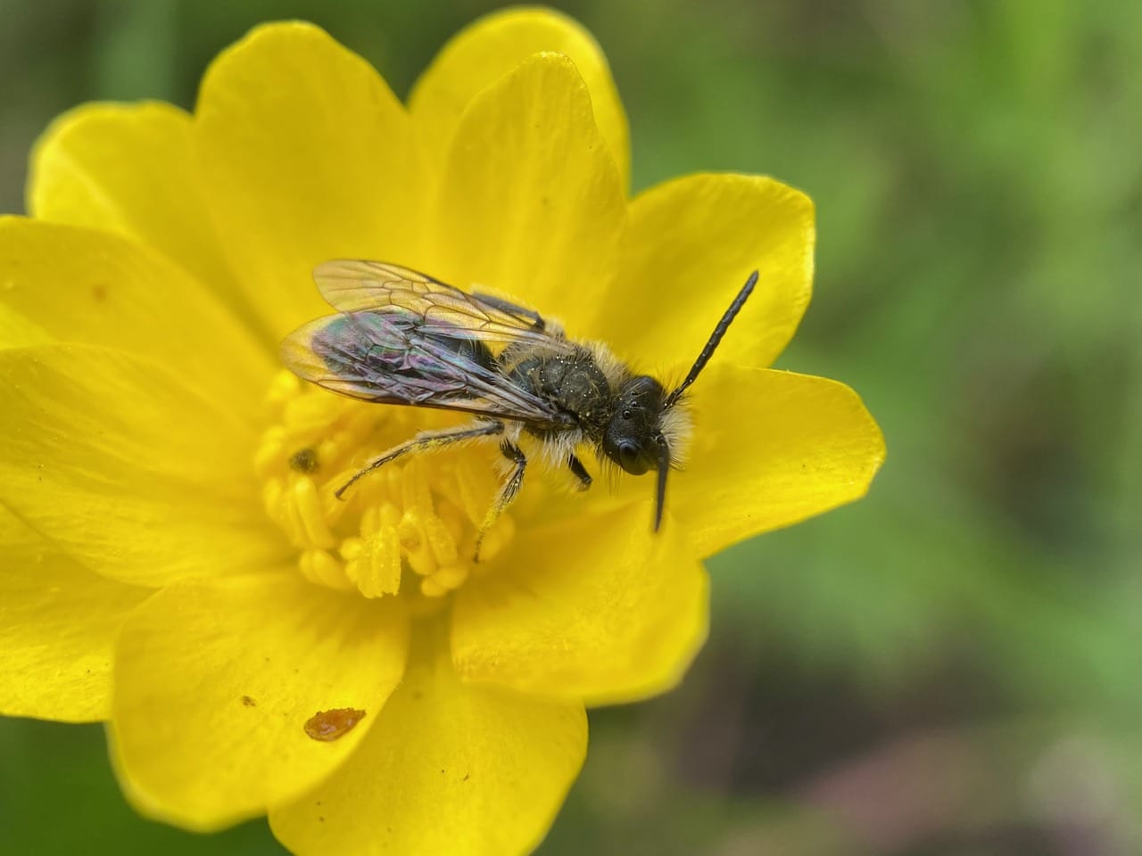 The female appears to be working on the anthers of the buttercup flower with her mandibles. Andrenids have a short, pointed tongue, not adapted for accessing nectar from deep-throated flowers.