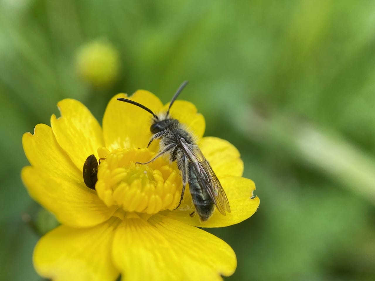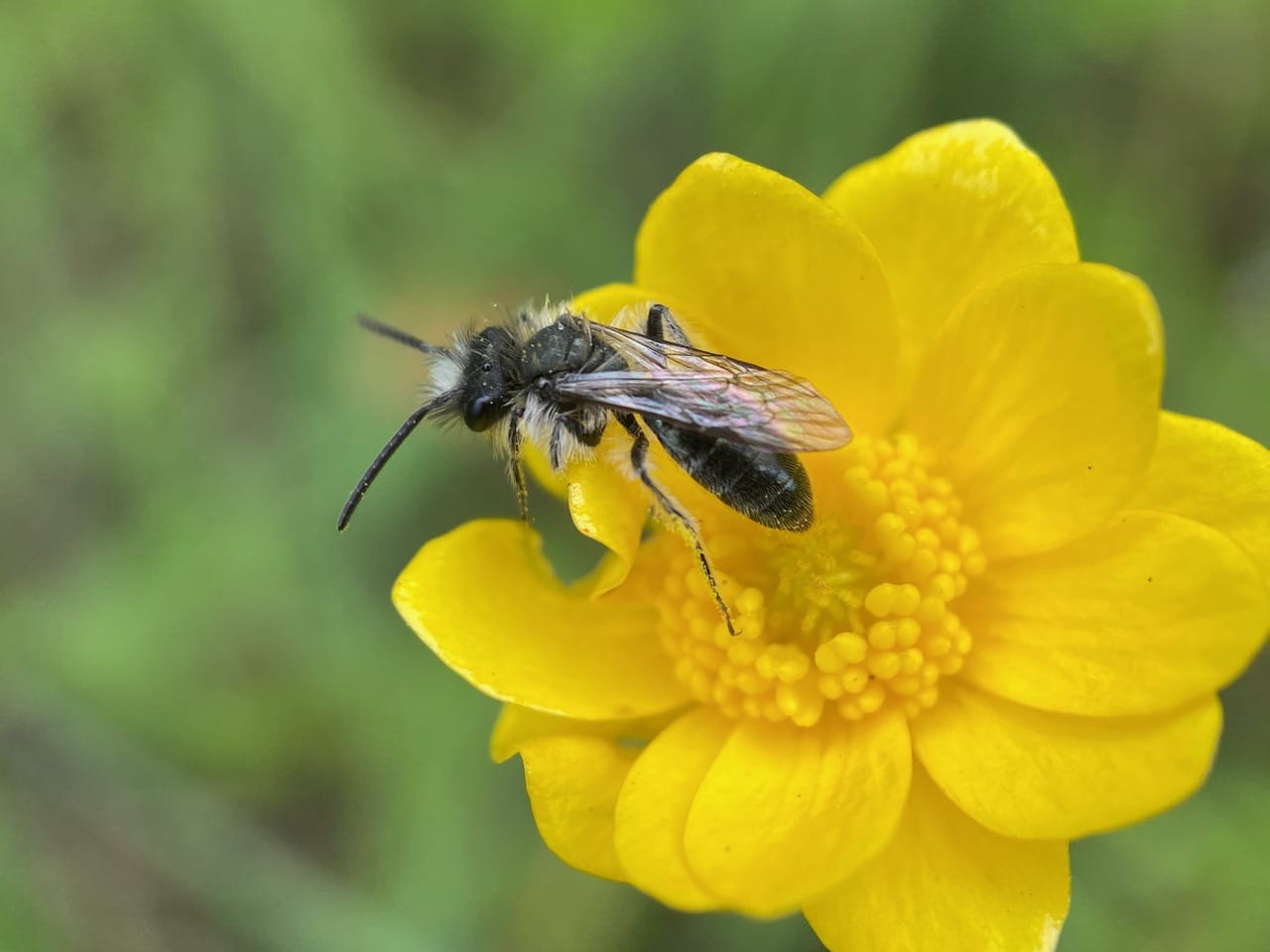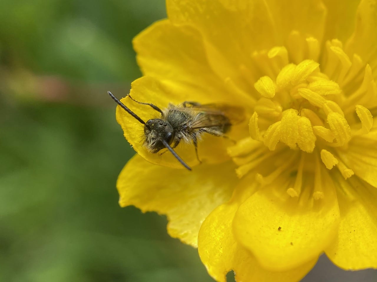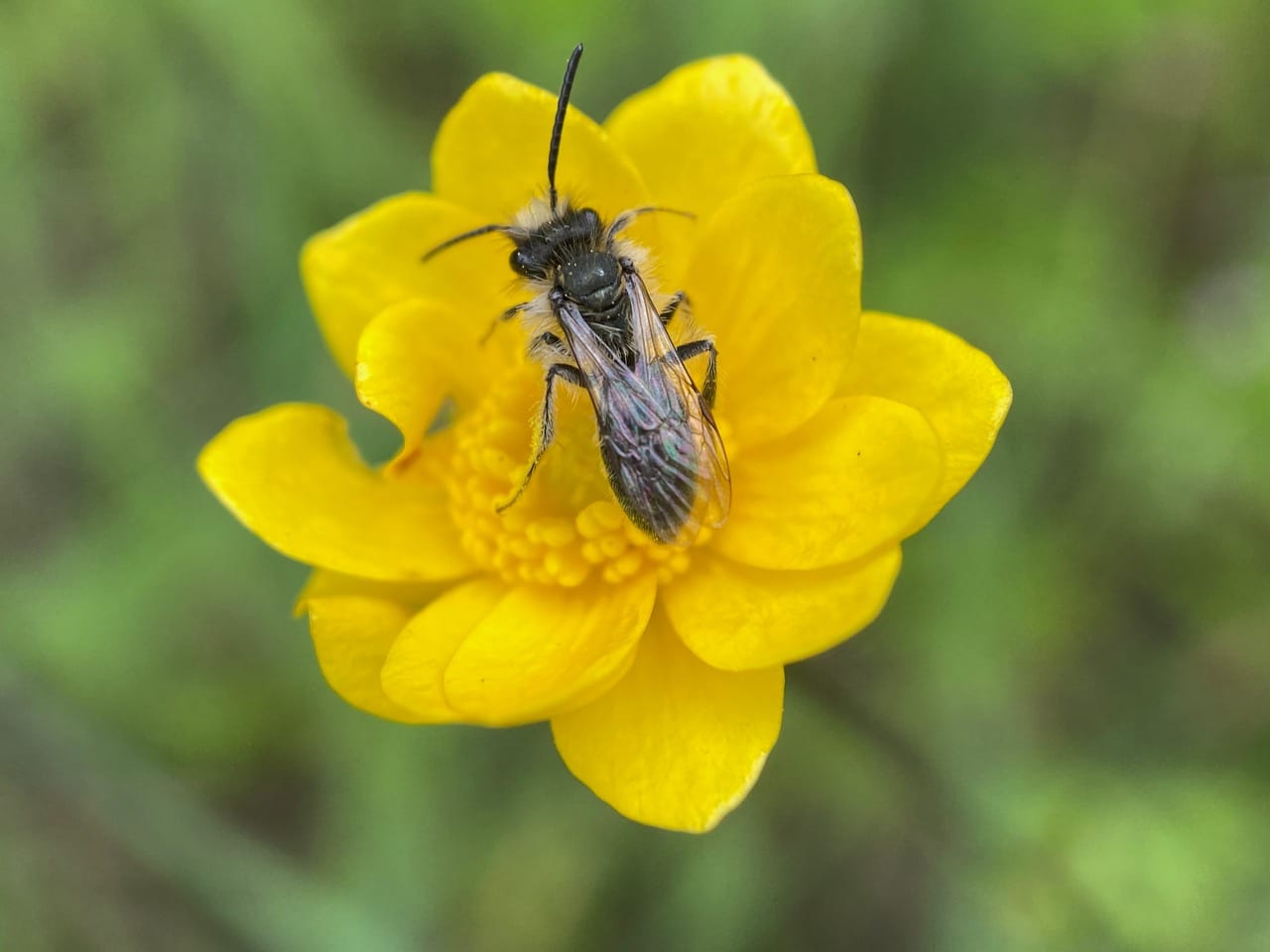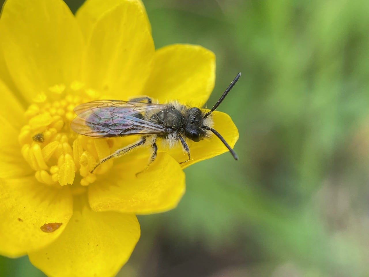 The female appears to be working on the anthers of the buttercup flower with her mandibles. Andrenids have a short, pointed tongue, not adapted for accessing nectar from deep-throated flowers.