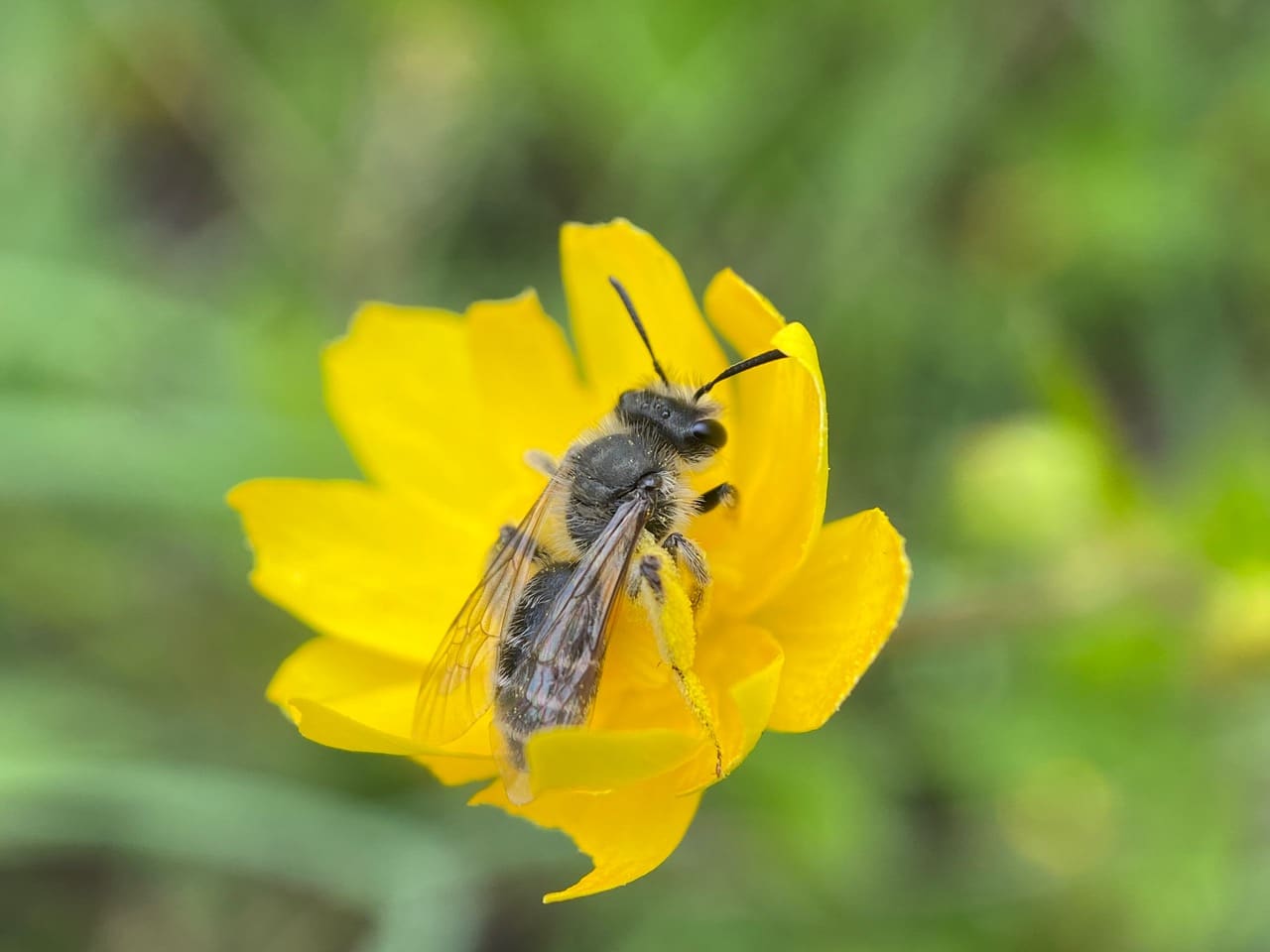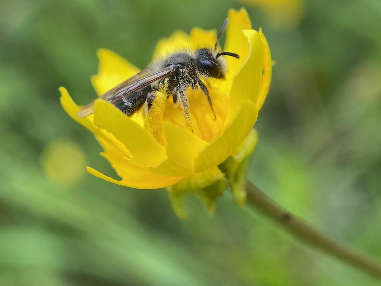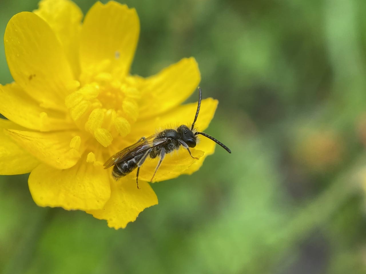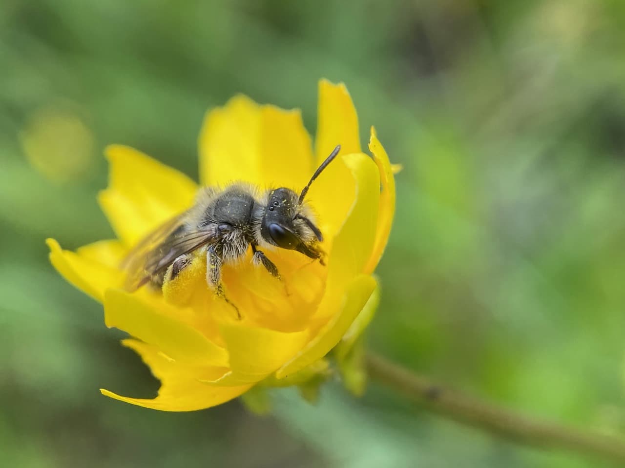 The female appears to be working on the anthers of the buttercup flower with her mandibles. Andrenids have a short, pointed tongue, not adapted for accessing nectar from deep-throated flowers.