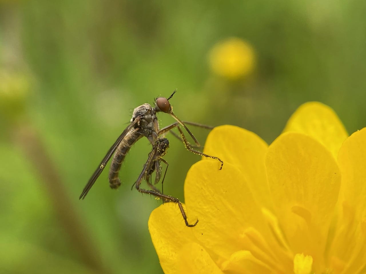Still holding onto the prey, the fly descends into the middle of the flower to probe for nectar with its long proboscis.