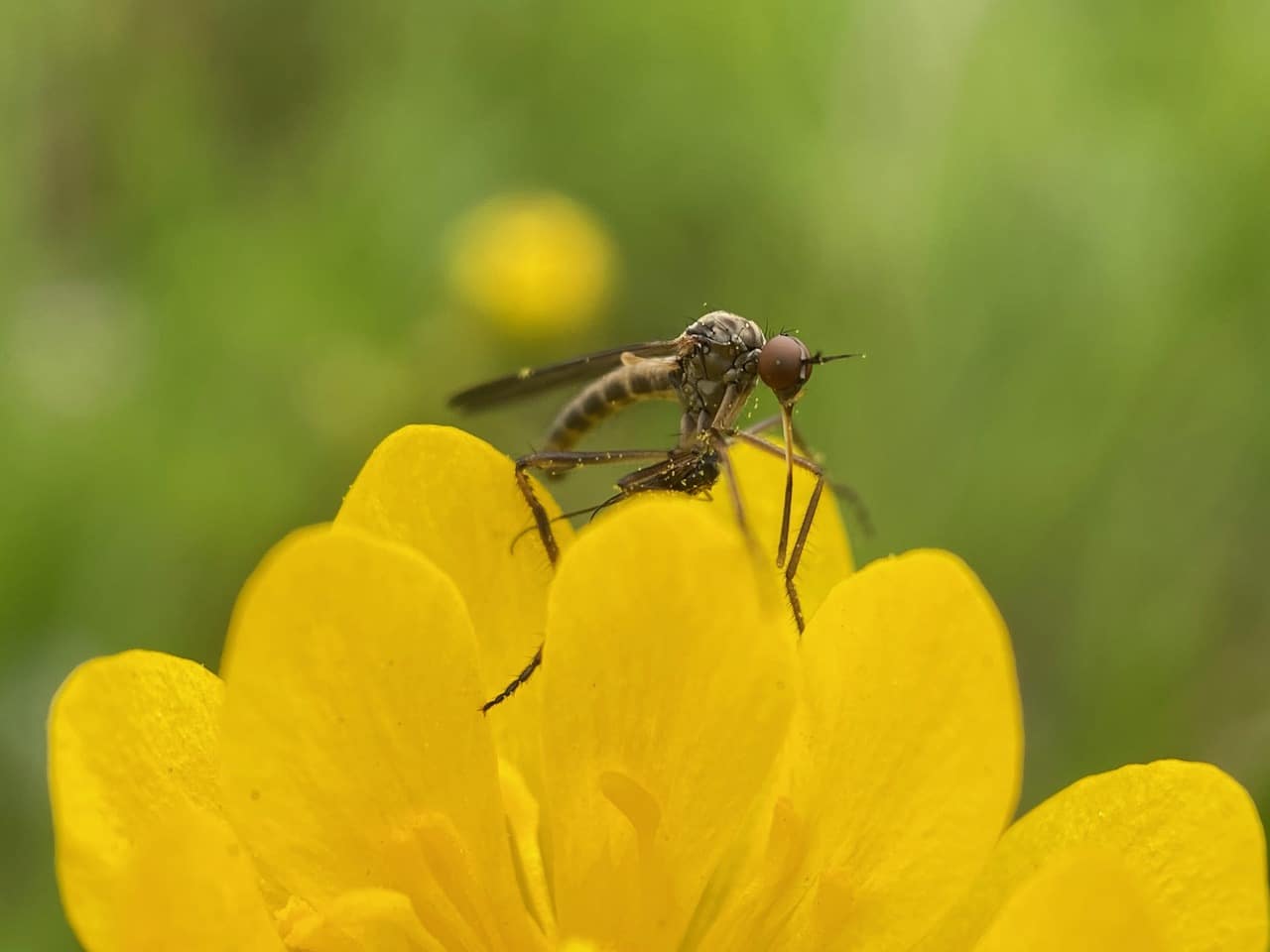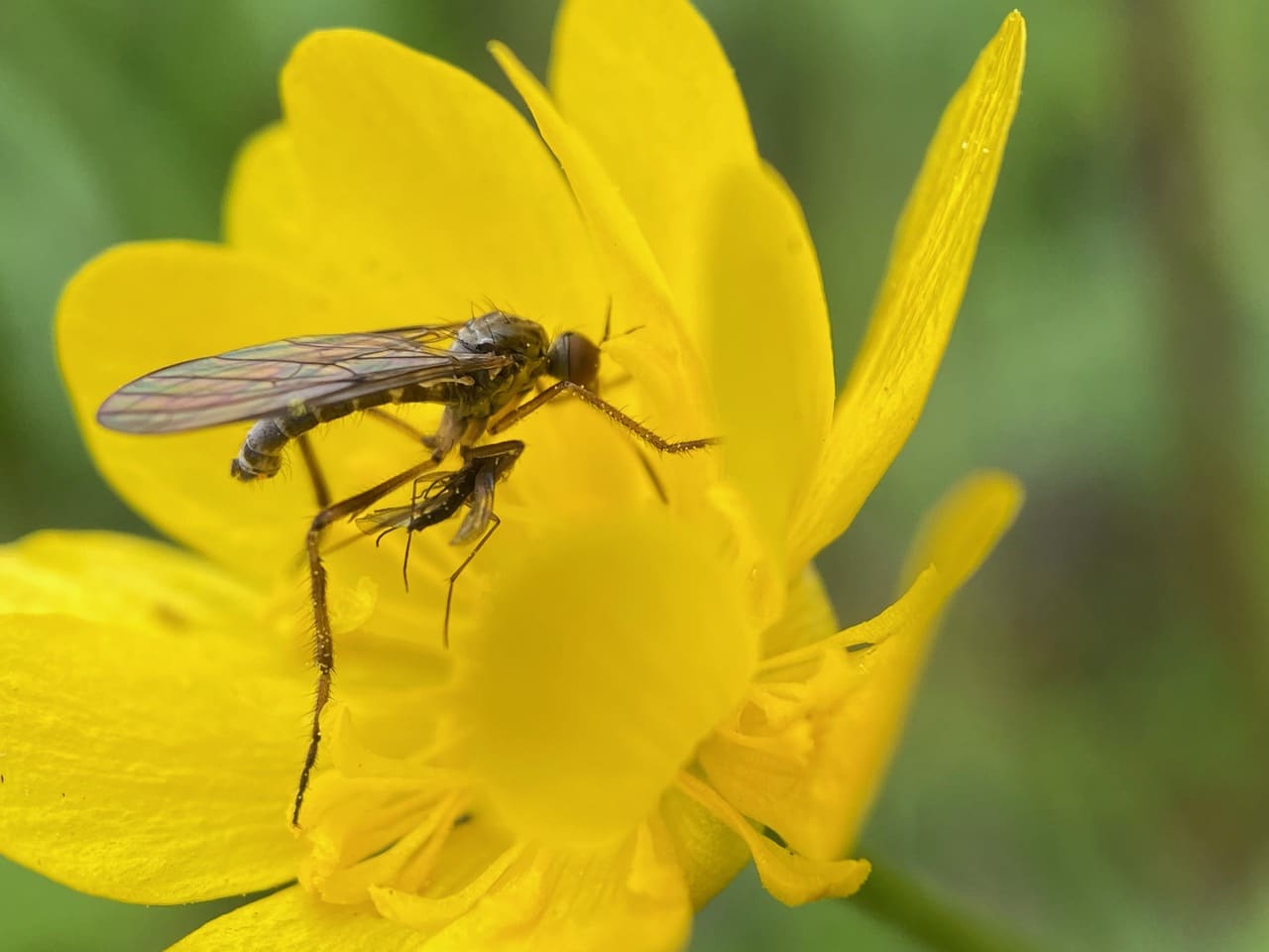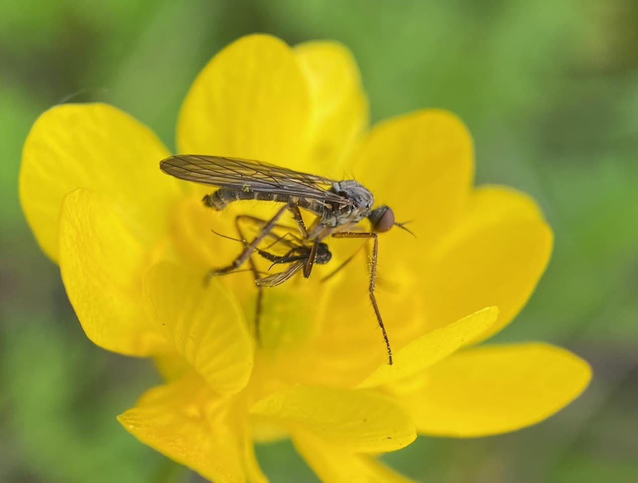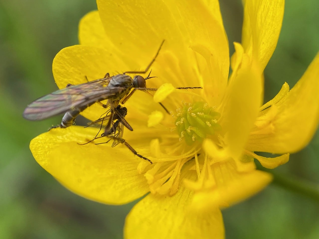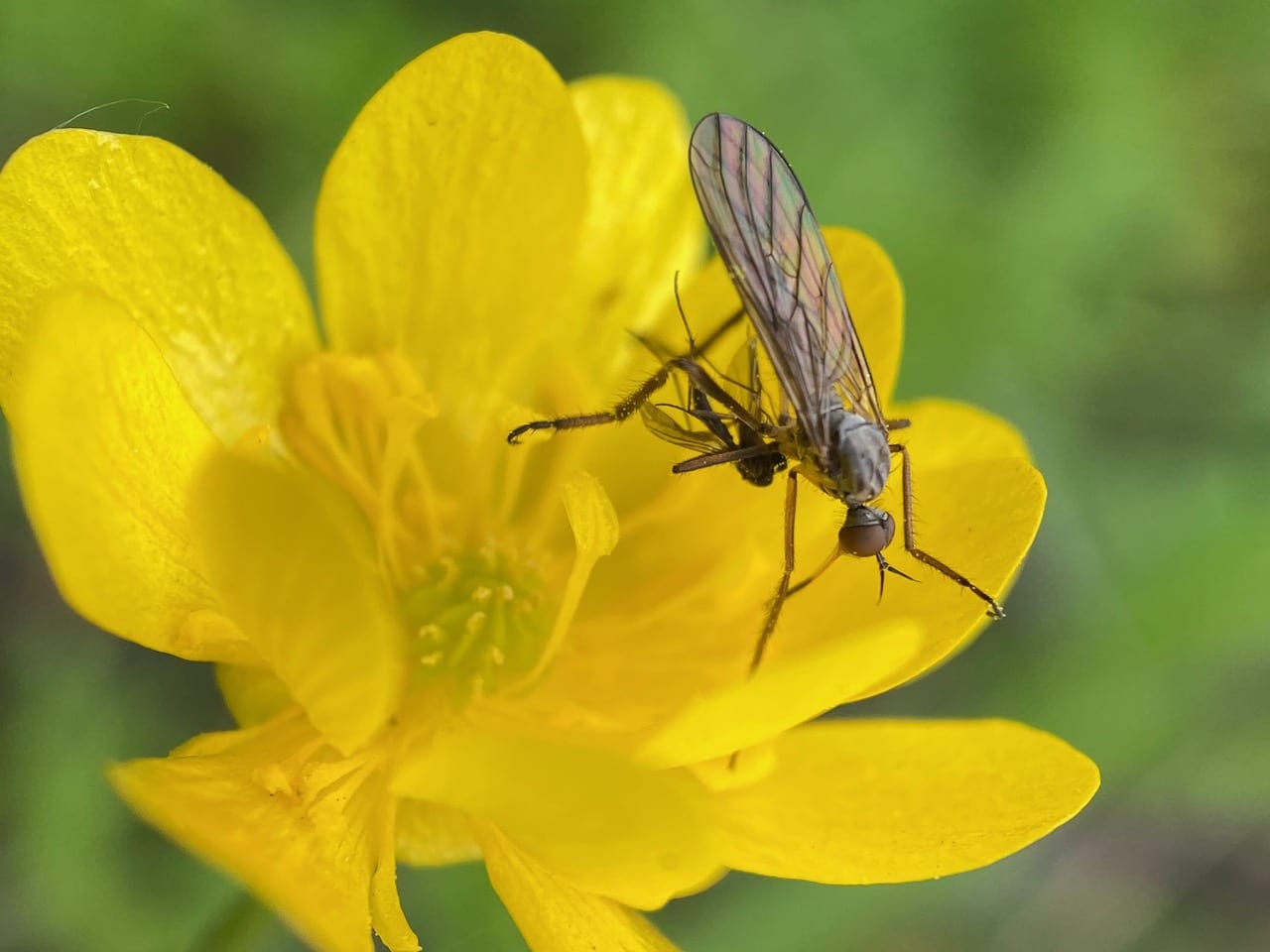 A Hybotid Dance Fly (family Hybotidae) is grooming on a petal of buttercup. The small fly is about the size of the anthers of the flower.