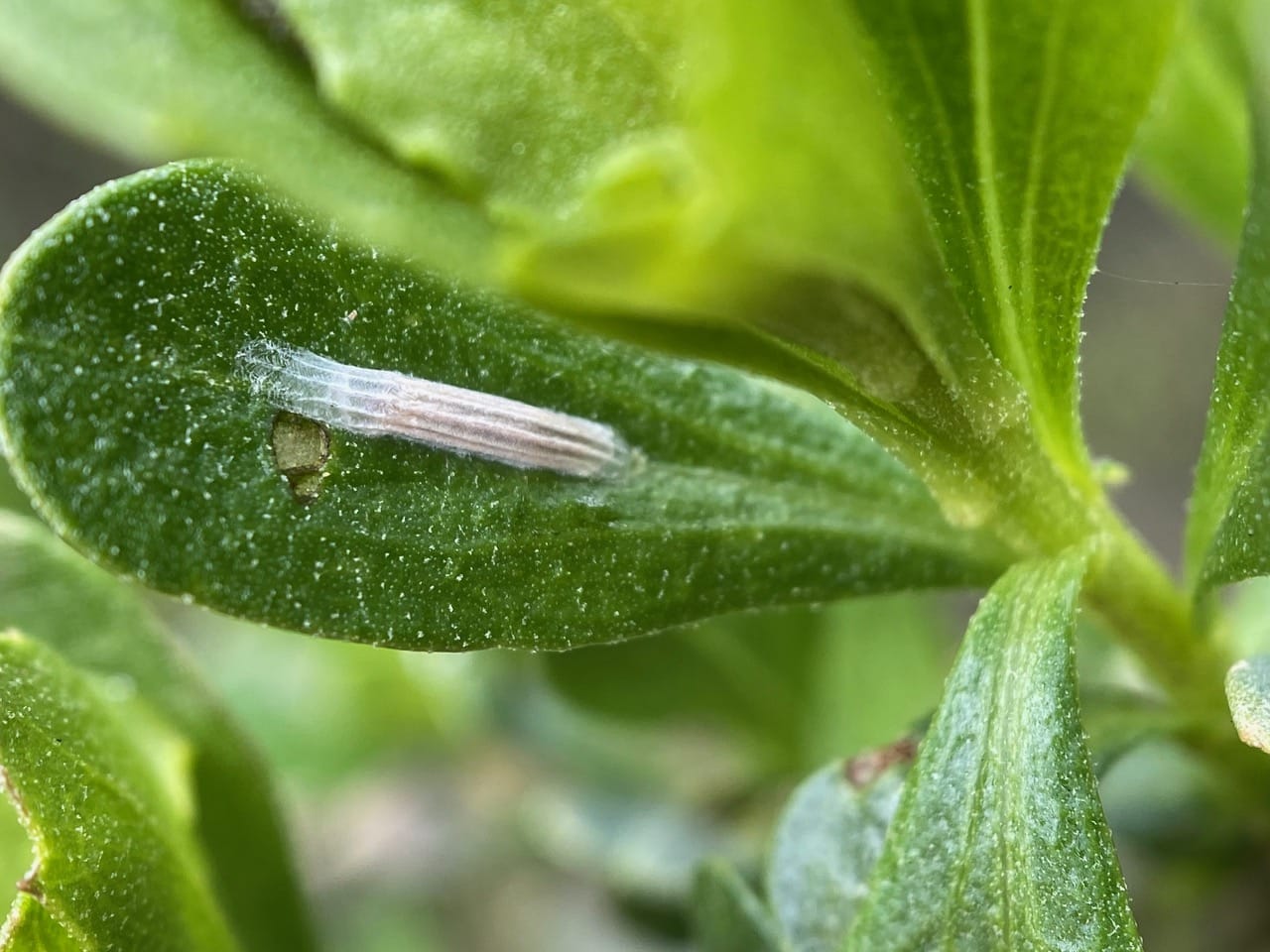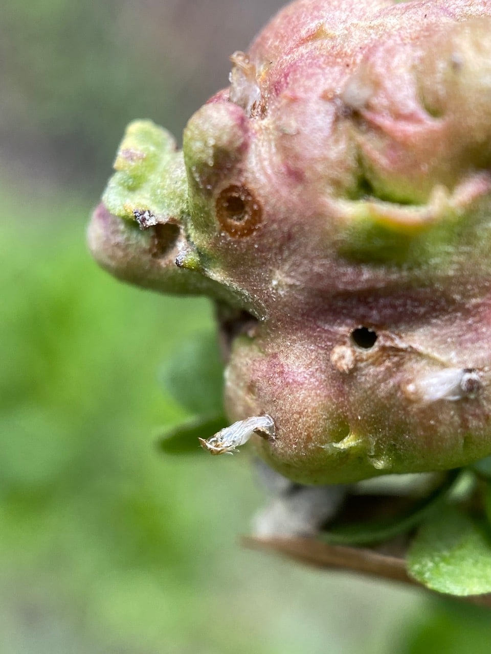 Zooming in on the holes on the galls, I find a couple of the pupa cases the gall midges have left behind when they emerged. This is just the beginning – there will be more gall midges emerging from this large gall in the next few days.