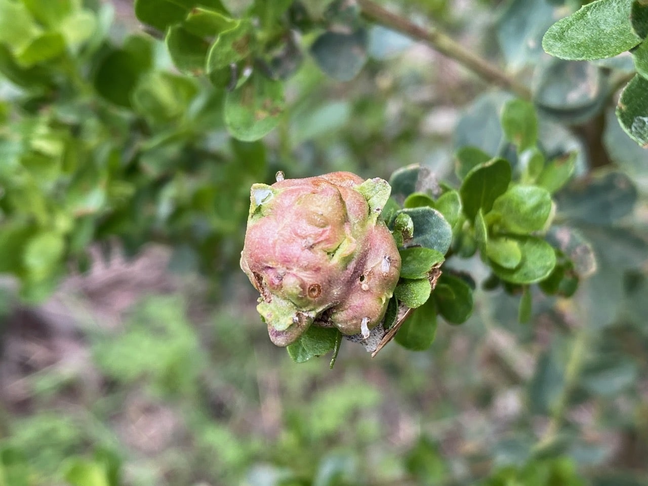 The Coyote Brush Bud Gall Midge, Rhopalomyia californica lays eggs into the flowerbuds of Baccharis pilularis, inducing lumpy, fleshy galls. Female midges lay clusters of eggs on terminal buds. The larvae that hatch out burrow between bud scales and commence feeding. The gall tissue swells around each of the larvae. When fully grown, larvae burrow to the surface of the gall, where they develop their partially protruding white cocoons and pupate. Adults look like miniature mosquitoes. The species, Rhopalomyia californica (family Cecidomyiidae) represents one of the rare situations among all gall insects where fresh galls and emergence of adults occur throughout the year.