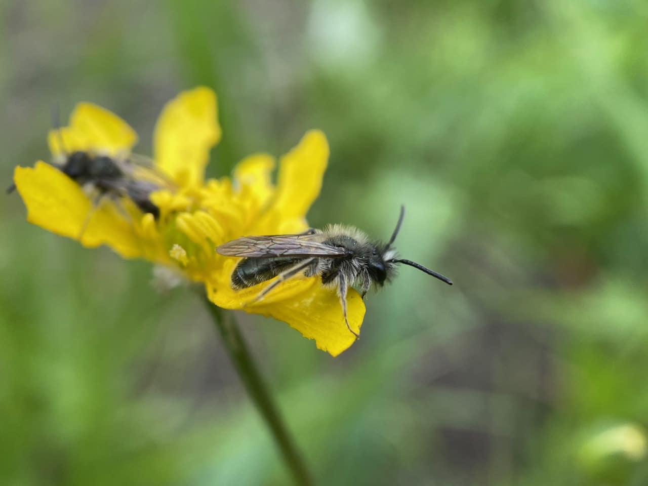 Why are these two male Andrenids perched on this badly chewed buttercup flower? The bees are standing stock-still like they are posing for a photo.