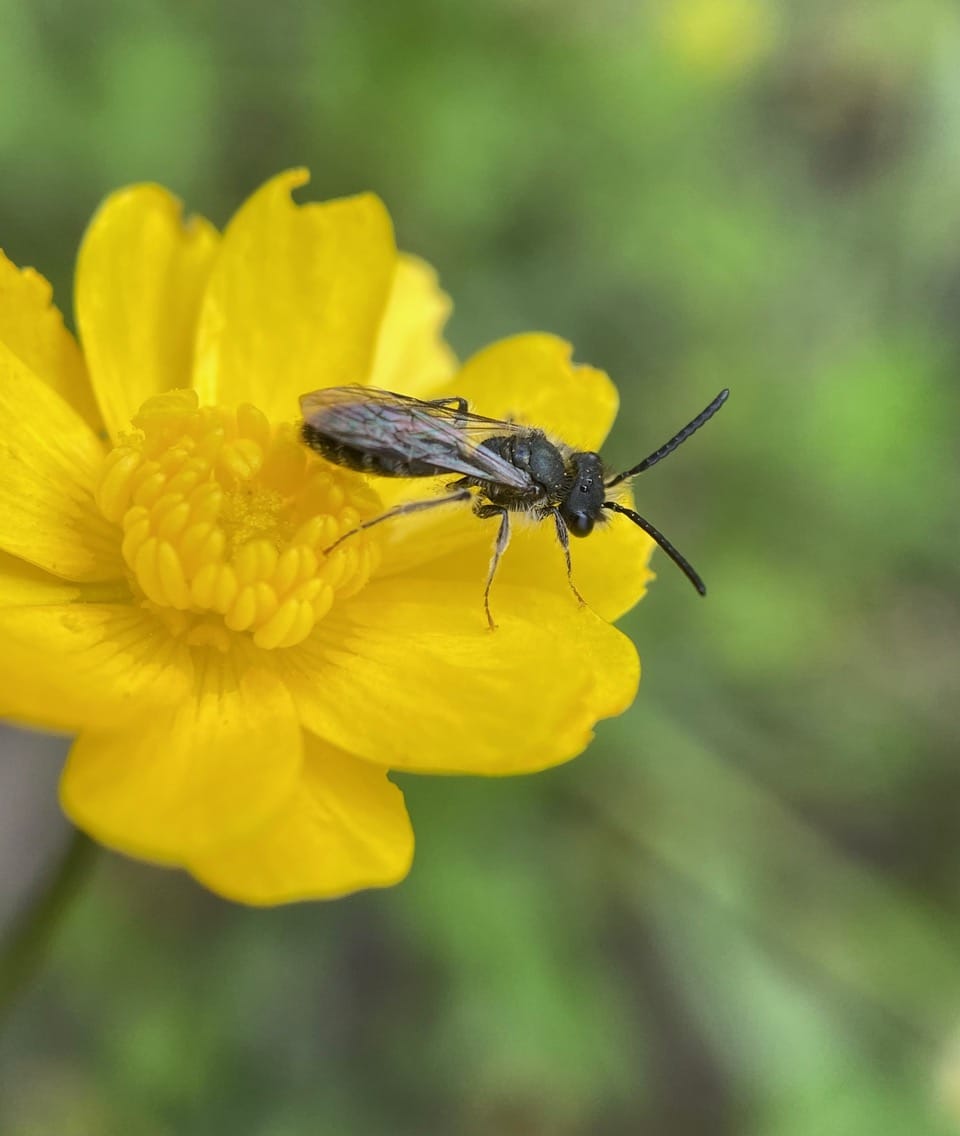 As I approach our little mining bee Sleepy Head’s patch of California Buttercups, Ranunculus californicus, I am delighted to see four little bees on separate flowers. Sleepy Head is no longer on his flower, and I am not sure if he is one of these bees. I quickly go around to check on each one of them. They are not moving and very easy to photograph