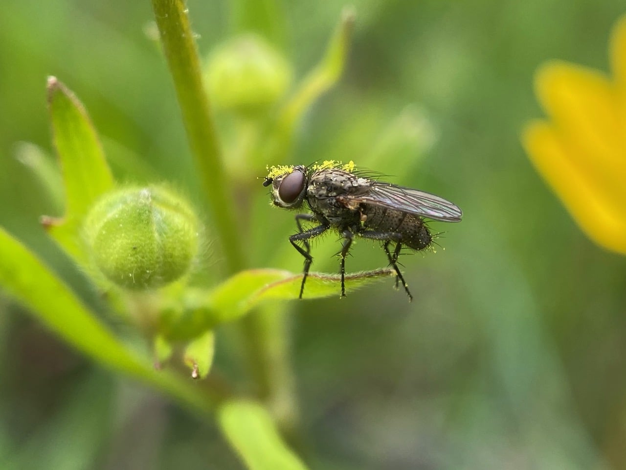 I turn my attention to the larger patch of buttercups across the trail. A Root Maggot Fly (family Anthomyiidae) has just fed in a flower, emerging with its head and thorax covered with yellow pollen. Members of the family Anthomyiidae are commonly called Root-maggot Flies. They are small to medium-size flies that resemble house flies but are somewhat more slender. They are usually dull gray or black and silver in color. The larvae typically feed in stems and roots of plants. Many are considered crop pests, and may attack root crops such as onions or rutabagas. Other species may feed on decaying matter, on feces, or are predators of other insects. Adult flies are important pollinators, usually feeding on nectar and pollen.