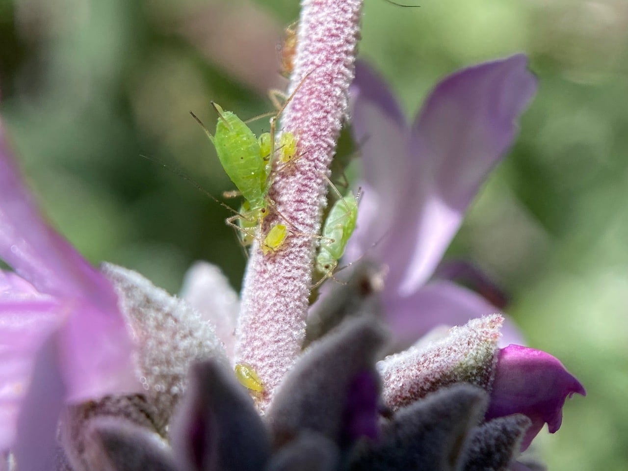On another flower spike, the colony of a different aphid species now appears to have new members. The smaller, dark aphids have previously been identified by iNaturalist as belonging to the genus Aphis. Now there are three of the green Macrosiphum aphids among them. I didn’t know that aphids would live in mixed aggregations!