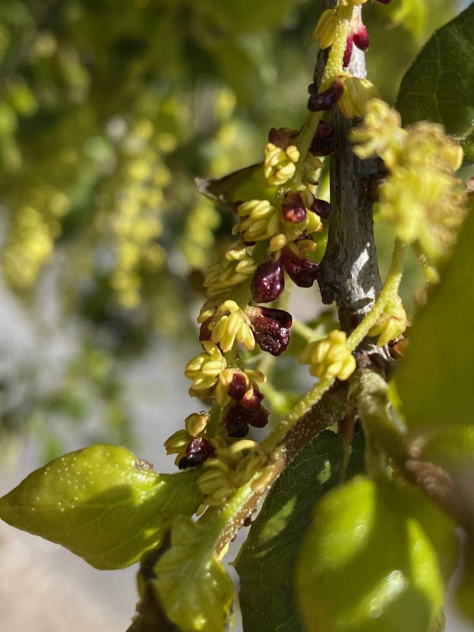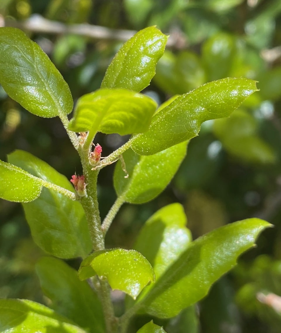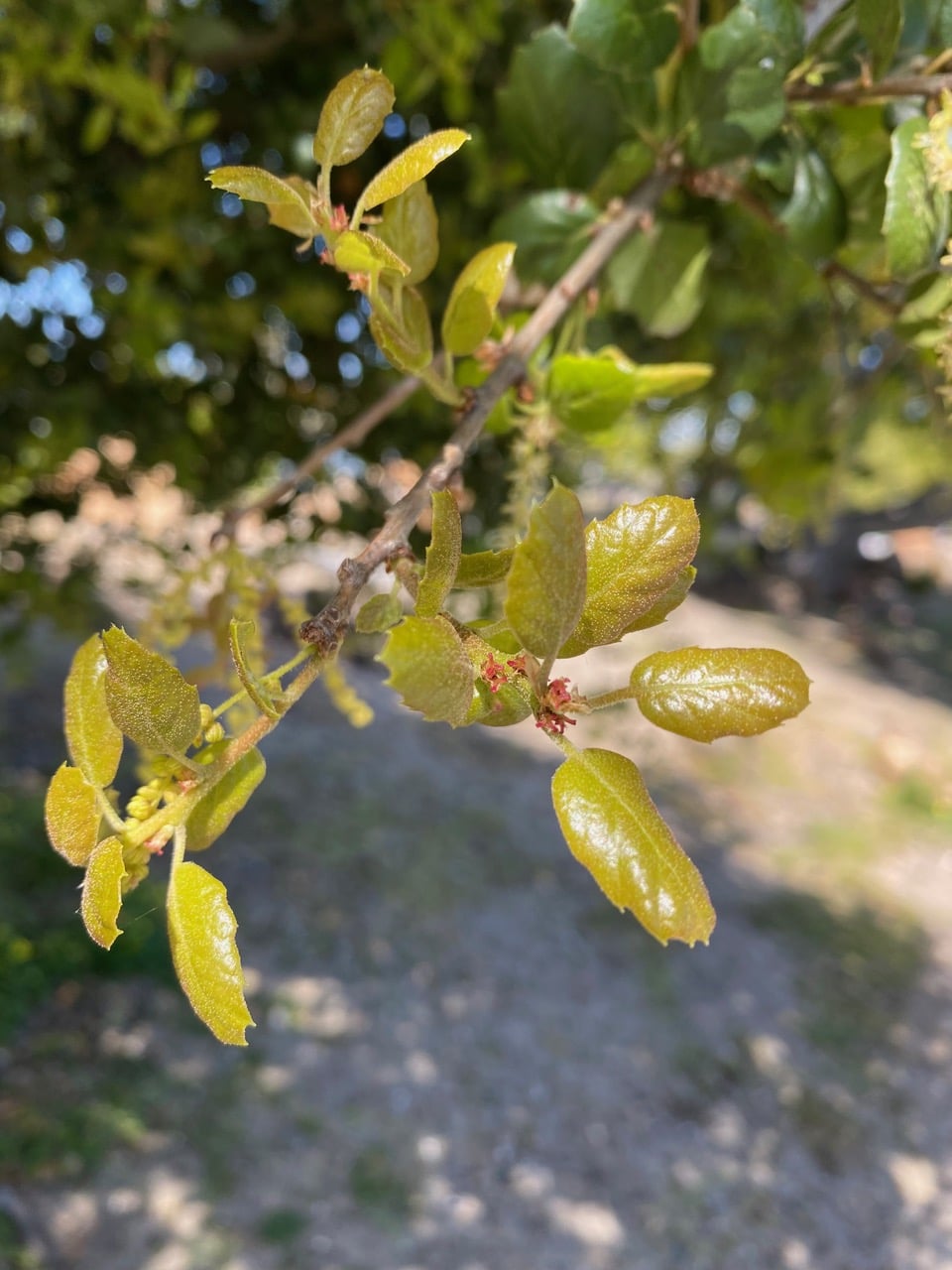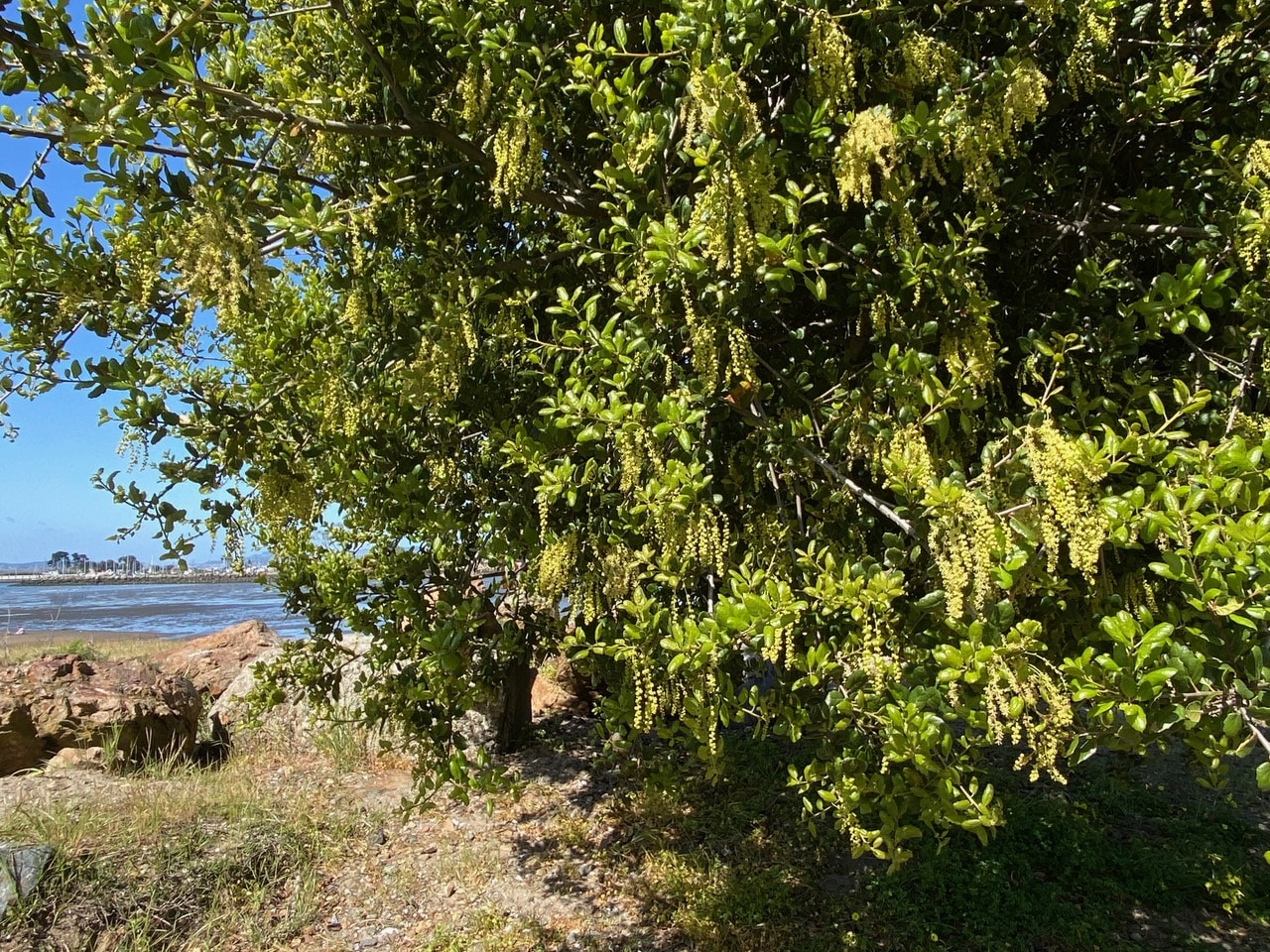 I waste no time locating the small Coast Live Oak, Quercus agrifolia by the beach. I am on a mission to find its female flowers! Since I posted about the male catkins, a friend has asked if I had any pictures of the female flowers. Nancy is working on a volunteer project restoring oaks trees in the Berkeley hills, and wonders if she could predict acorn crop ahead of time by the prevalence of female flowers in the spring. She is not sure how to identify or locate the flowers on the tree. If I were to find any flowers, this small tree at Crab Cove is my best bet. Its lowest branches are only about 3 feet off the ground, and I can photograph the flowers at eye level if they are there.
