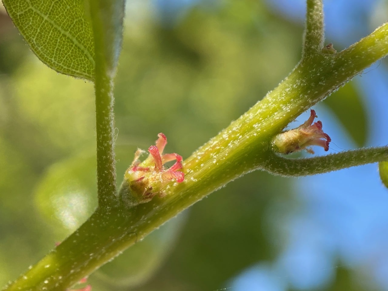 Ah, it doesn’t take much effort to find the tiny female flowers. Their red color helps tremendously. They are all located at the leaf axils of the tender young shoots growing beyond (distal to) the male catkins.