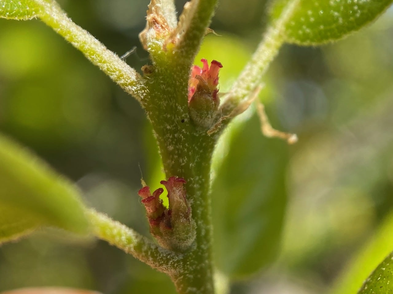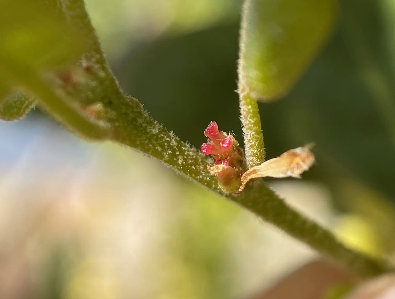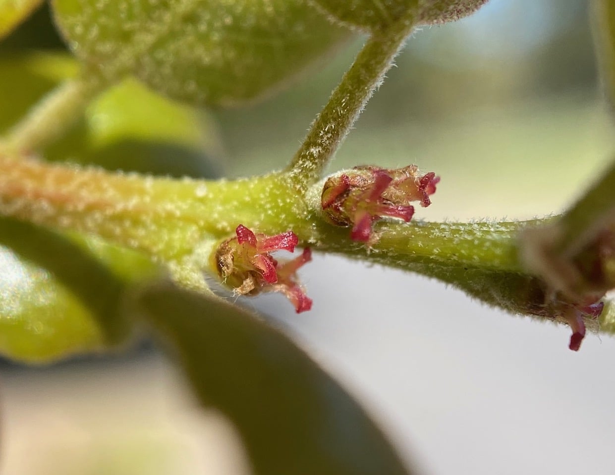 The female flowers of Coast Live Oak are tiny, barely 2-3 mm. They are without petals, essentially a reddish three- or four-parted stigma emerging from a hairy bud at the leaf axils. They appear succulent and sticky, ready to intercept wind-borne pollen shaken from the male catkins. Since these flowers do not depend on insects for pollination, why are they attractively colored red? I venture a guess that the red pigment, anthocyanin serves a protective function to shield the naked stigmas from the damaging ultraviolet light from the sun.