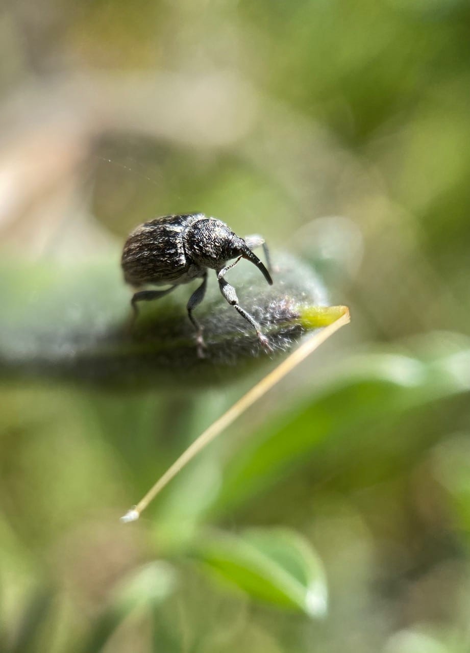 A Weevil is walking on a pea pod of Silverleaf Lupine, Lupinus albifrons. It is the Leguminous Seed Weevil, Tychius lineellus (family Curculionidae) found in North America.