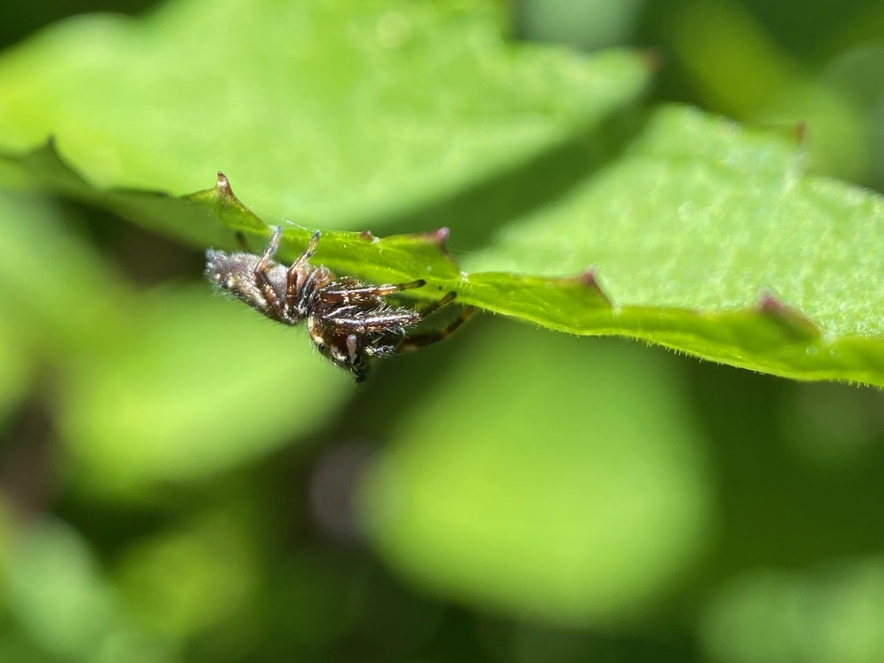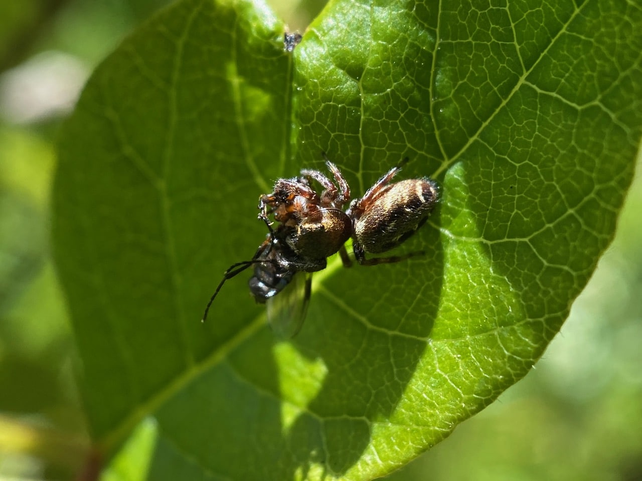 Salticids are free-roaming hunting spiders. They do not weave a web to catch prey. They stalk, then pounce on their prey. Just before jumping, the spider fastens a safety line to the substrate. It can leap 10-20 times their body length to capture prey.