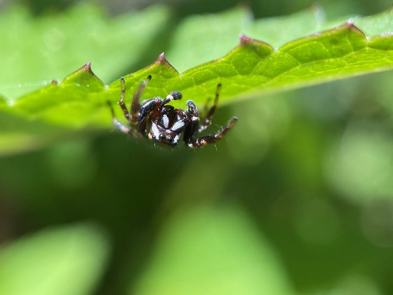 A tiny spider is watching me from a Bee Plant leaf. The male Oak Jumping Spider is easily recognizable, but the spider is so small one needs a macro lens to see his painted face.