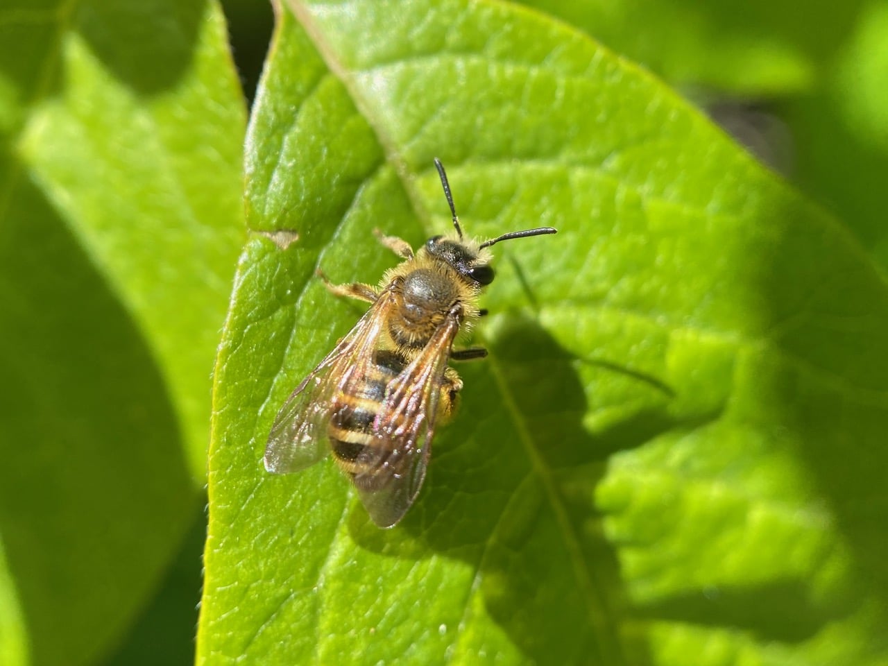 A female Golden-haired Miner Bee, Andrena auricoma (family Andrena) lands on a Poison Oak leaf. She has shorter antennae, and a stouter build than the males. The females are slightly larger, 8-10 mm long, compared to the males’ 6-9 mm. Females carry pollen in the scopae on their hind legs. From now on, we might be seeing more of the females at the flowers. In many solitary bees, males tend to emerge from their nests before the females. A female bee is able to determine the sex of her offspring while she’s laying her eggs. The fertilized eggs will develop into females, while those not fertilized with sperm will develop into males. This system of sex determination is termed haplo-diploidy. Female bees tend to lay female eggs first, in the back of the nest, while the male eggs are deposited in the cells closer to the entrance of the nest. The males, usually smaller, develop faster and emerge before the females, conveniently freeing the path for their sisters.