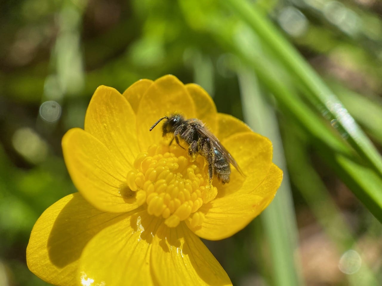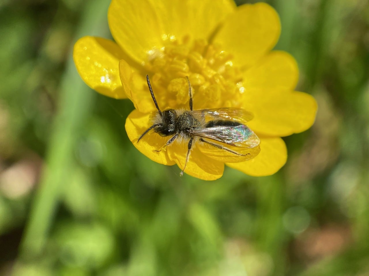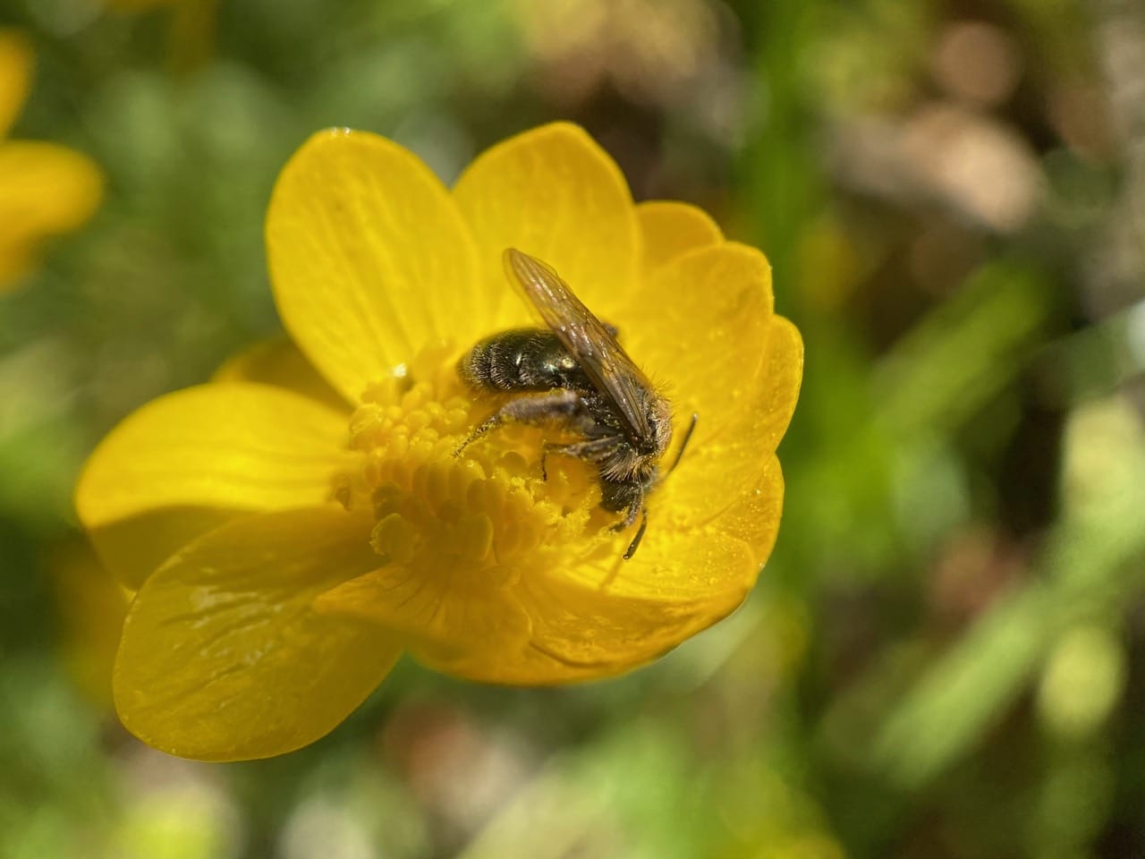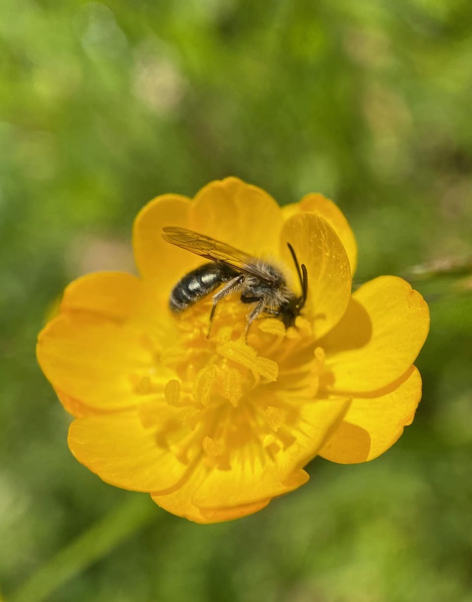 All seems to be silent as I scan each patch of buttercups. What happened to all the Mining Bees (family Andrenidae) that I saw on these flowers yesterday? Don’t the males sleep on the flowers?