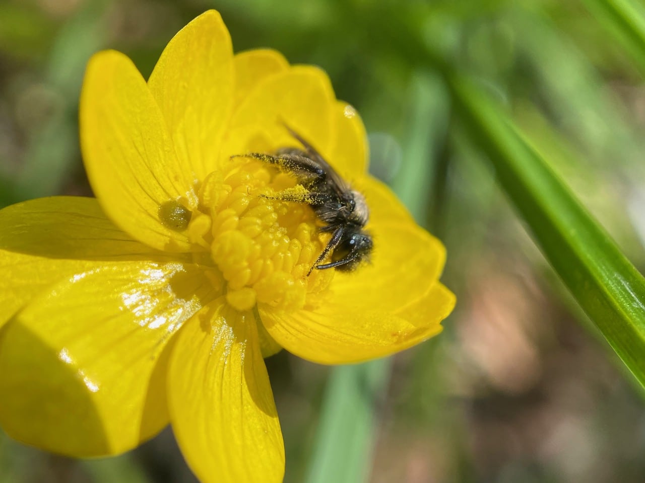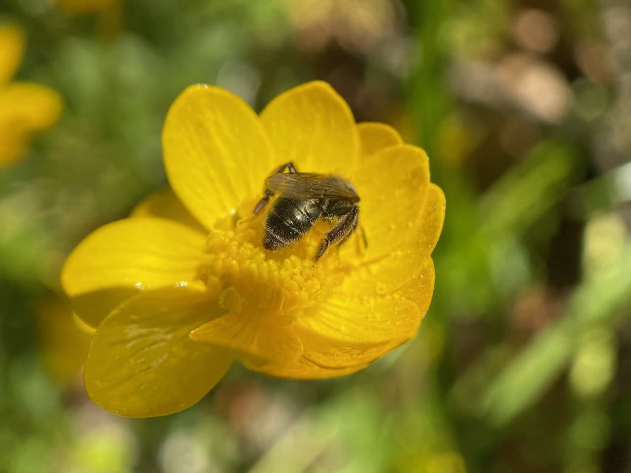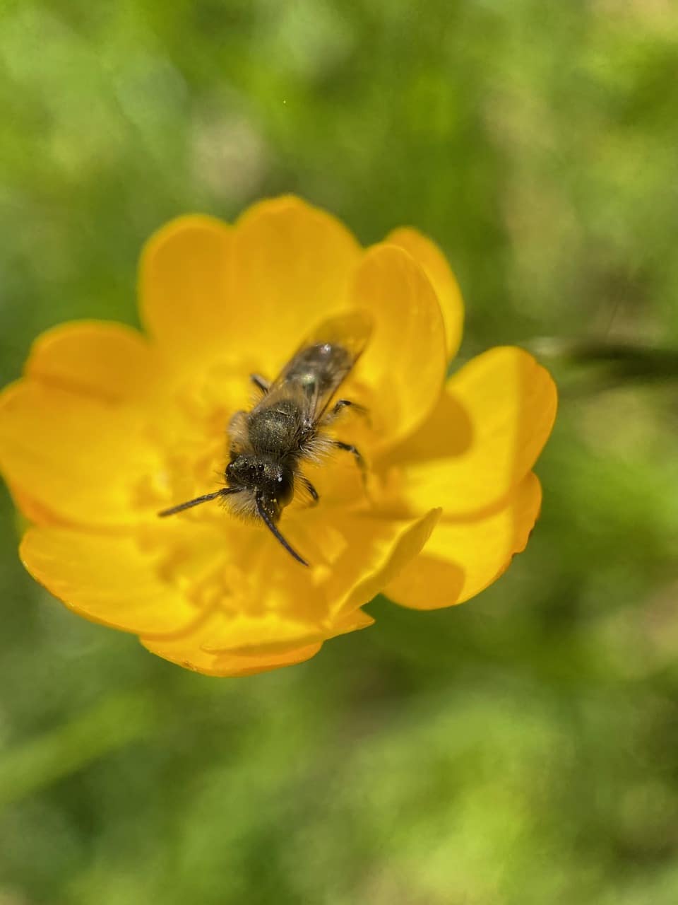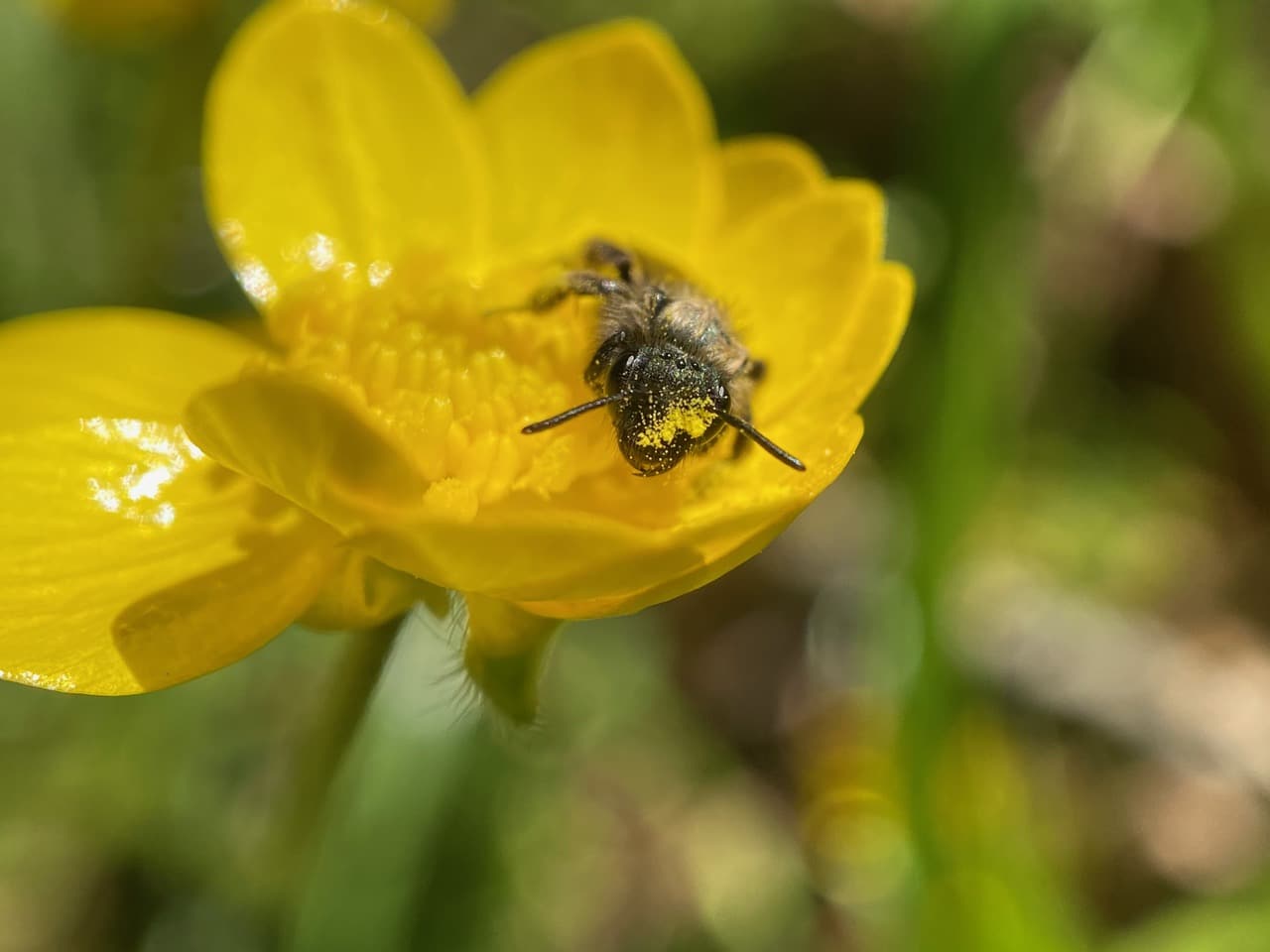 All seems to be silent as I scan each patch of buttercups. What happened to all the Mining Bees (family Andrenidae) that I saw on these flowers yesterday? Don’t the males sleep on the flowers?