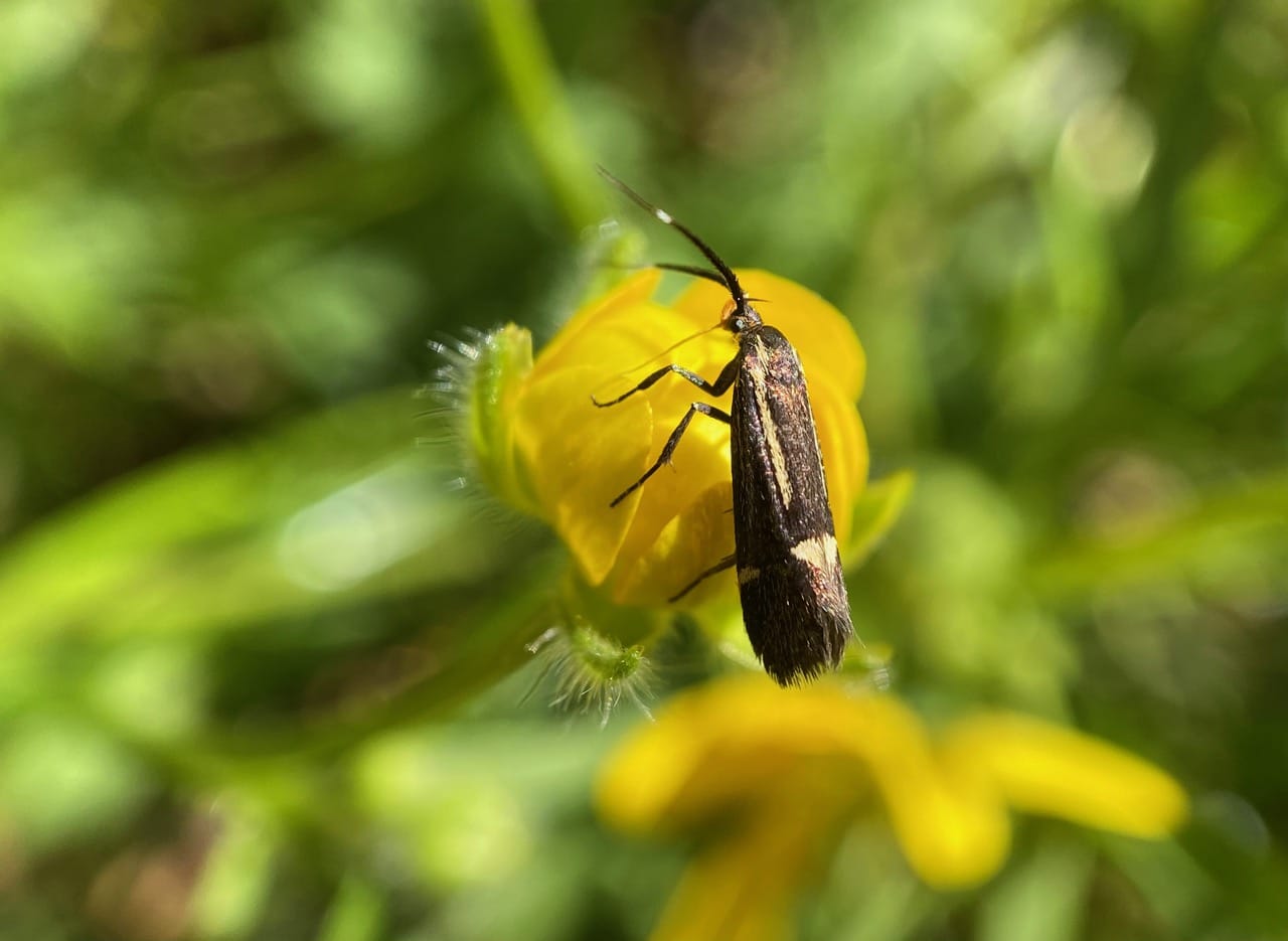 Its iridescent scales flashing in the sun, a small day-active moth, Sulphur Tubic, Esperia sulphurella (family Oecophoridae, or concealer moths) is taking nectar from a flower of a California Buttercup that is not even fully open. Note that its proboscis is not aimed at the center of the flower, but at the base of a petal where a nectary is located. How do these insects know where the hidden nectar is? By smell?