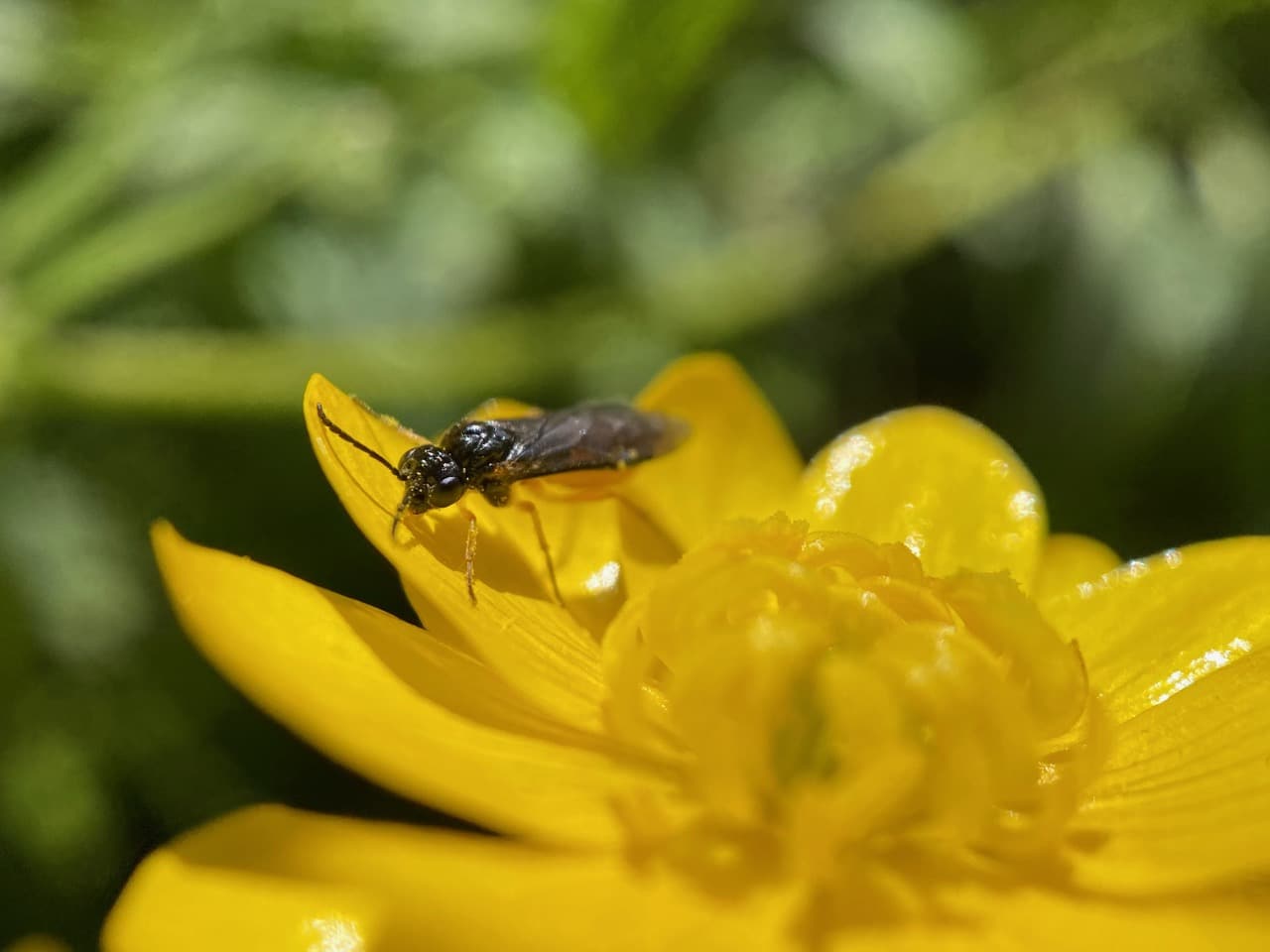 I look around to see who else might be foraging on the California Buttercup flowers. Walking out from the stamens of a flower, a Hybotid Dance Fly (family Hybotidae) has sticky pollen stuck to its wings and antennae. It makes a lengthy attempt to clean off the pollen before flying away.