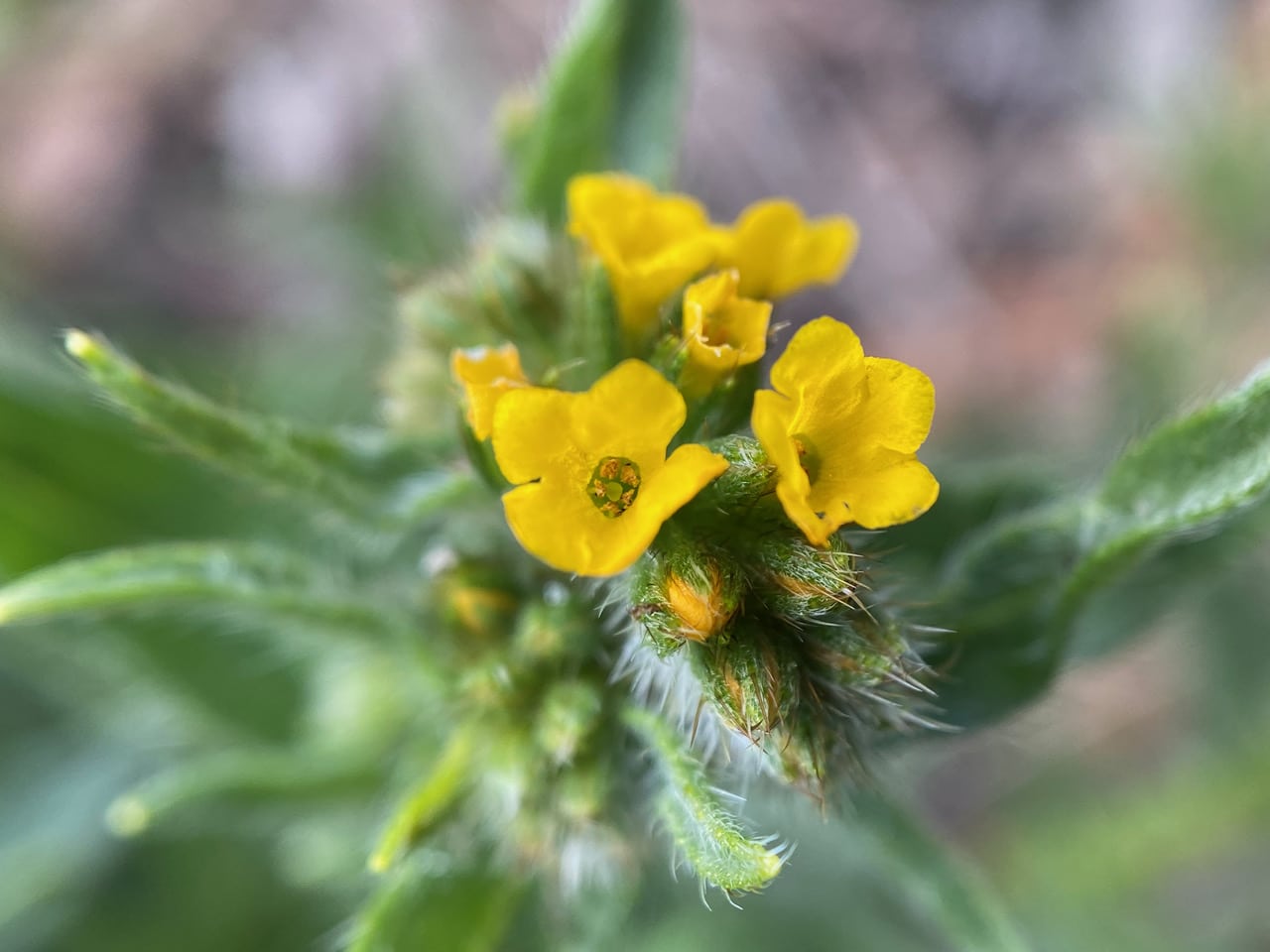 The five petals of of Common Fiddleneck, Amsinckia intermedia are fused into a tube for most of their length, then separating into broadly glaring, rounded lobes.