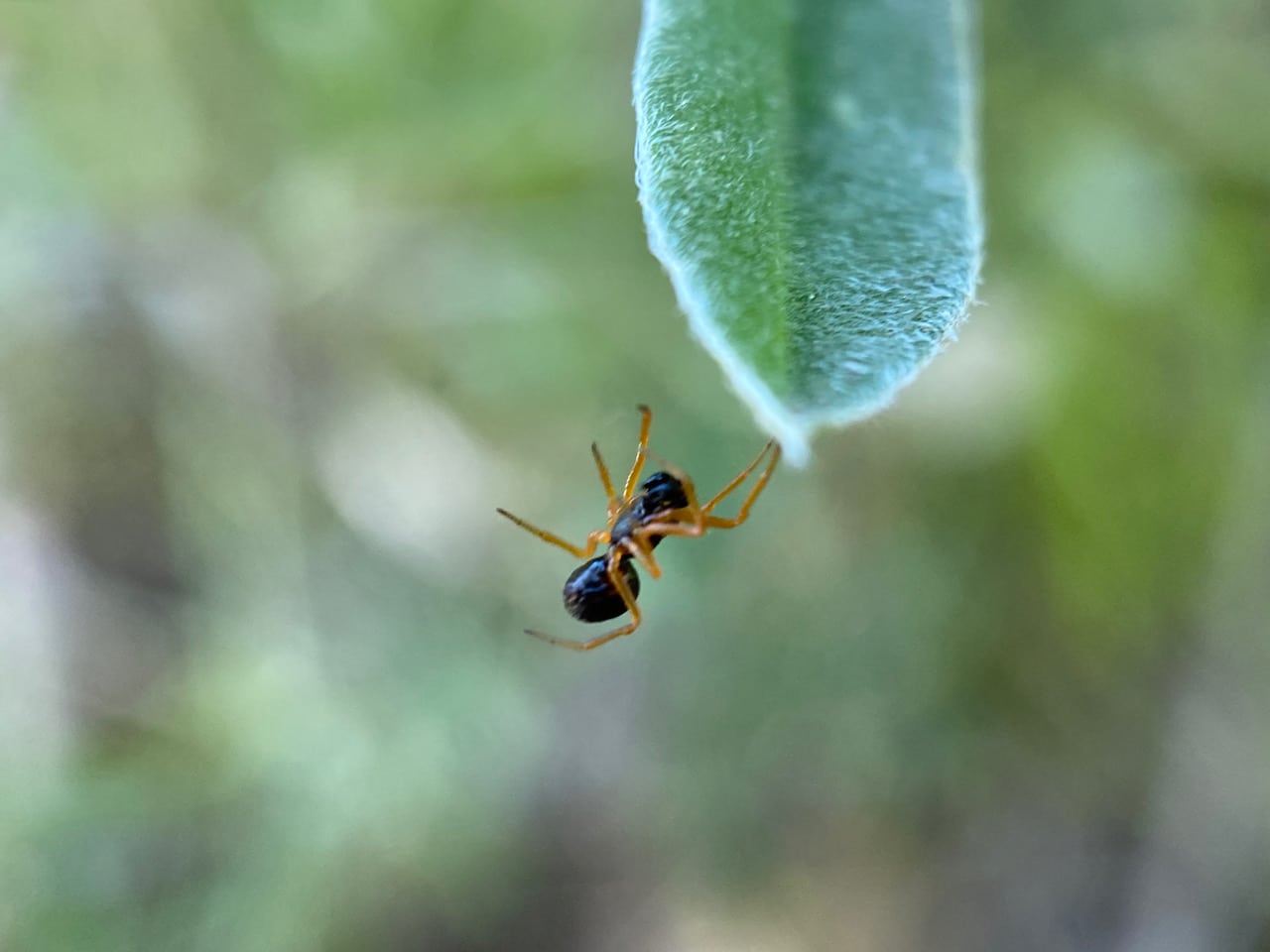 The unsuccessful predator swiftly glides away on an invisible silk line. It’s a black spider with yellow legs. About 12 inches away, it safely lands on a lupine leaf. Whew, that was an exciting predation attempt! Amazingly, the spider’s escape route/safety line was already in place before the attempt.