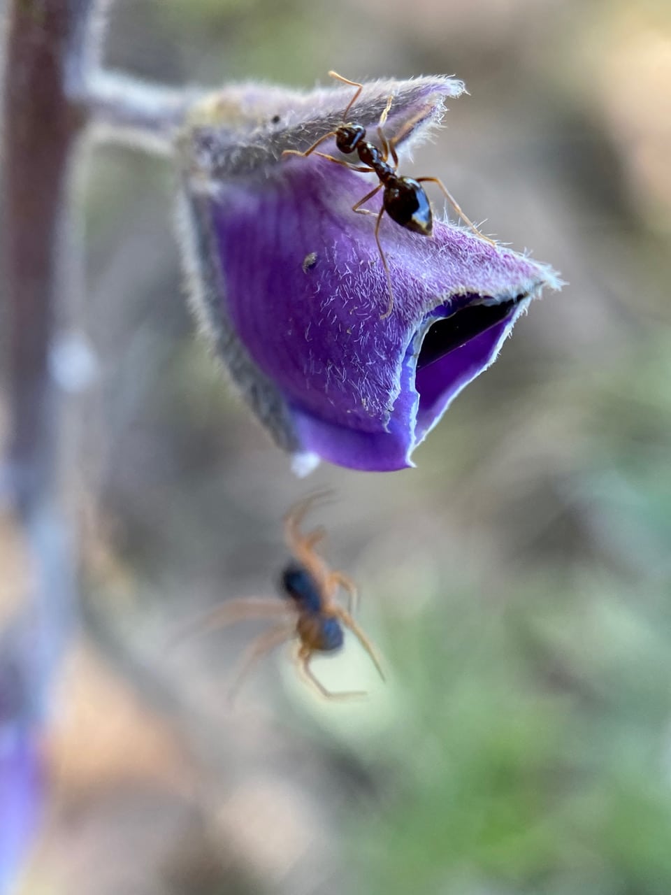I watch as a Winter Ant, Prenolepis imparis exits a chewed lupine flower. Is the ant responsible for the damage, or is it just an opportunistic scavenger taking advantage of an already breached flower. Suddenly there is a swift movement from below the flower. A small spider is trying to nab the ant, but misses!